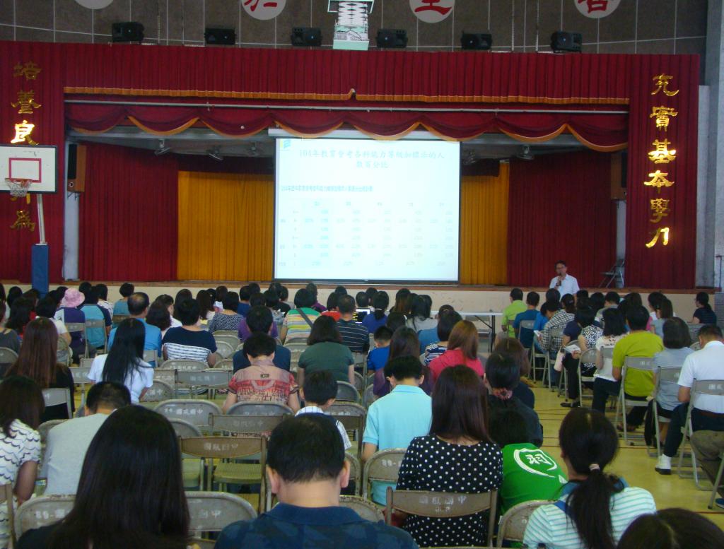時間:104年10月3日 地點:本校體育館、各班教室 內容: 0830-0920 許俊傑校長主講「十二年國教宣導」 0920-1010 吳碧珠校長主講「親子溝通」 1010-1030 校務交流 1045-1230 各班班親會