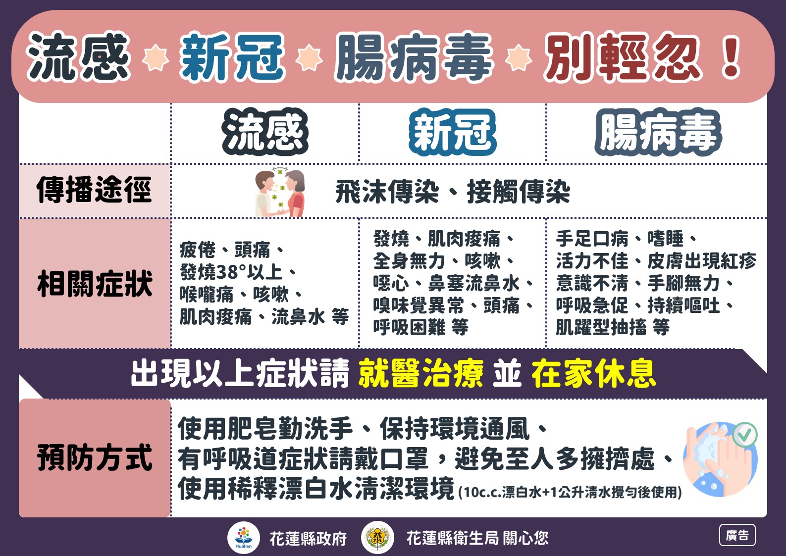 本縣衛生局製作之「流感、新冠及腸病毒防治」衛教單張電子檔1份,請參閱。