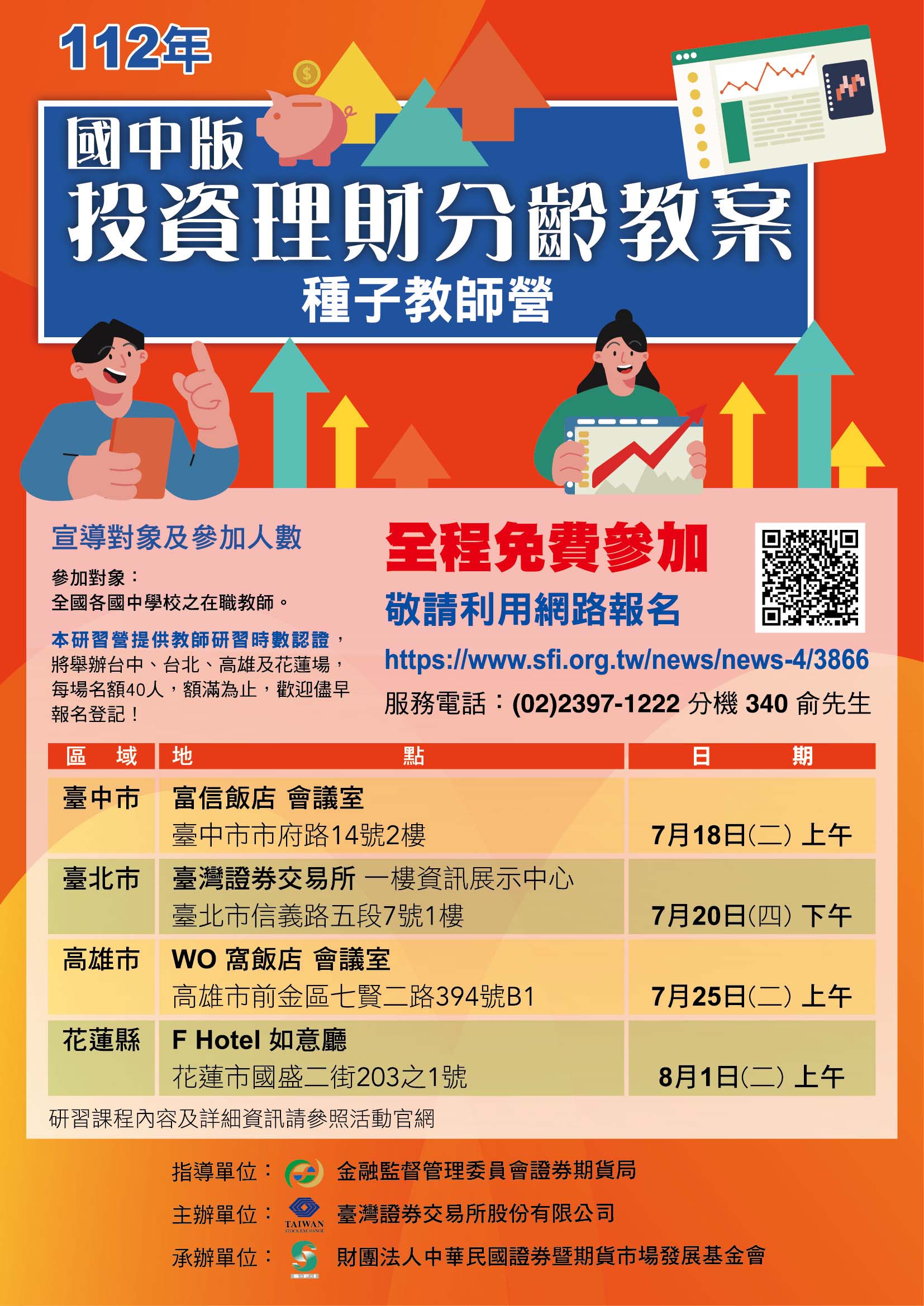 - 為鼓勵國中教師運用並瞭解教案內容重點及獎勵方式,特舉辦種子教師研習營,希望藉由培養種子教師,再傳授學子正確理財觀念,實際應用於日常生活中,進而提升其金融素養。