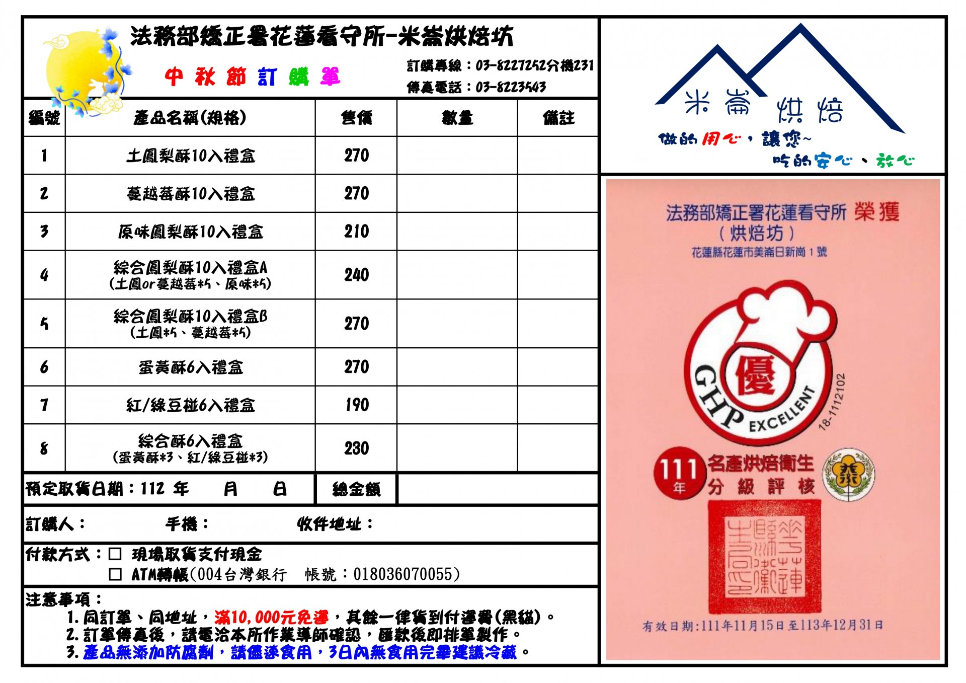 中秋佳節即將來臨,檢送本所自營作業食品科產品型錄及訂購單各1份,歡迎貴機關與同仁踴躍訂購,並惠予張貼公告,請查照。