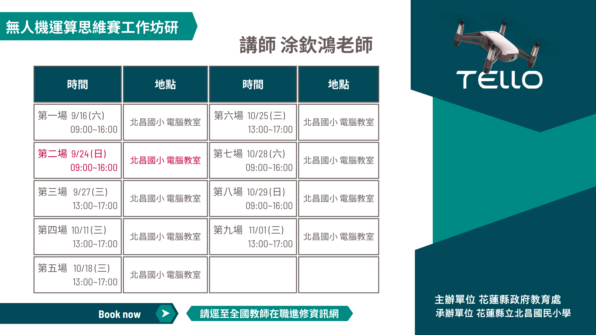 二、 | 為配合「2023 花蓮縣華紙公益盃全國無人機運算思維大賽」特辦理 9 場共訓研習課程,以期本縣選手熟悉競賽相關規定,穩定選手參賽當日狀況,課程資訊如下: |
