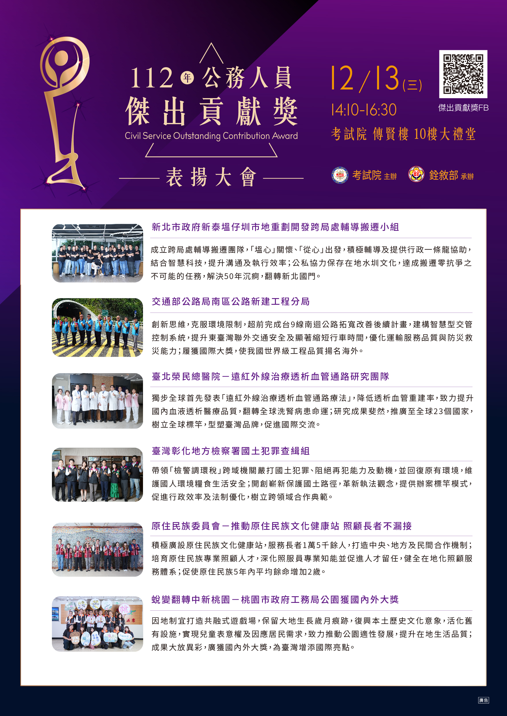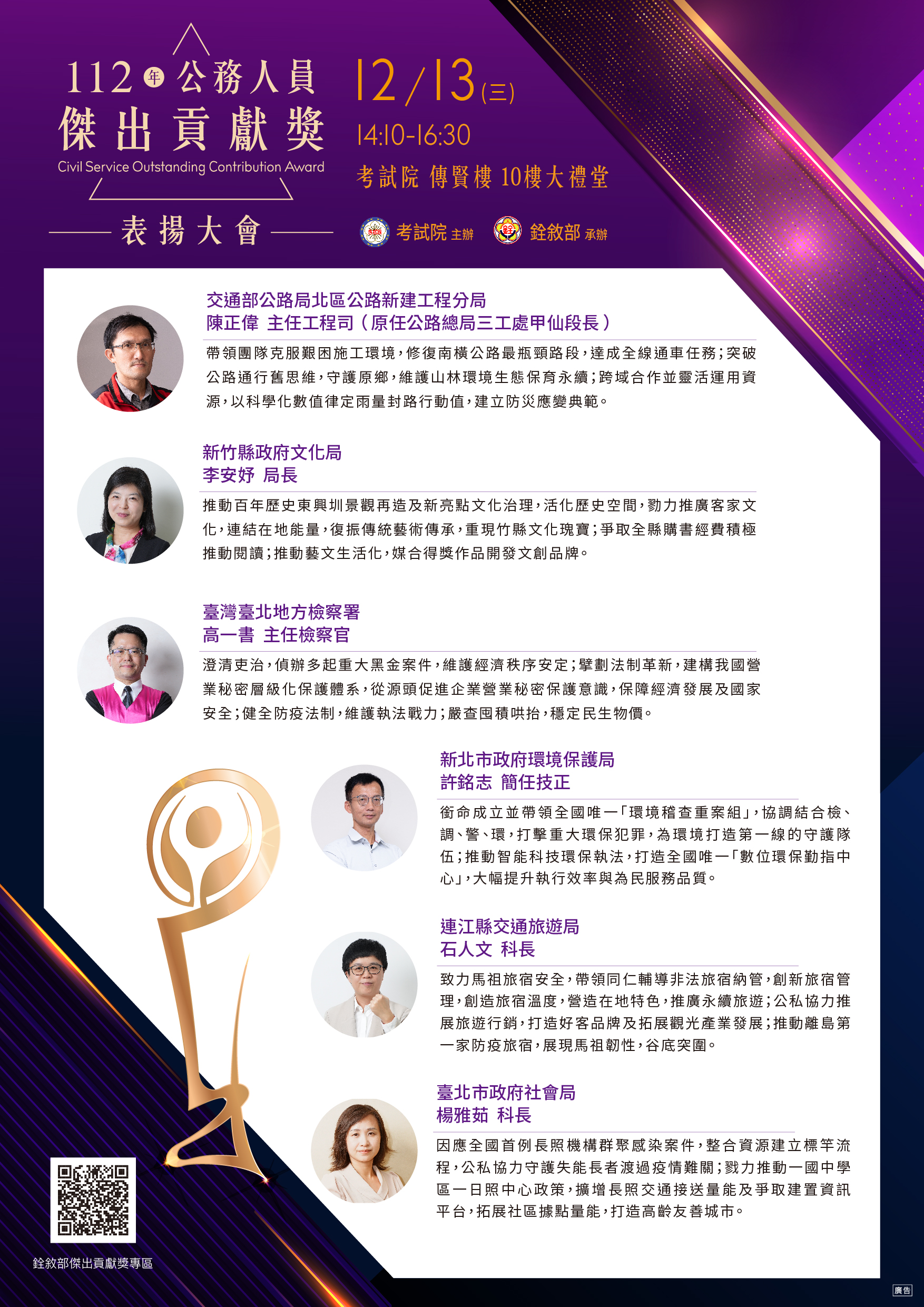 有關銓敘部公告「112年公務人員傑出貢獻獎表揚大會」海報及得獎者具體事蹟簡介,並轉知網路抽獎活動及表揚大 會直播等相關訊息,請查照。