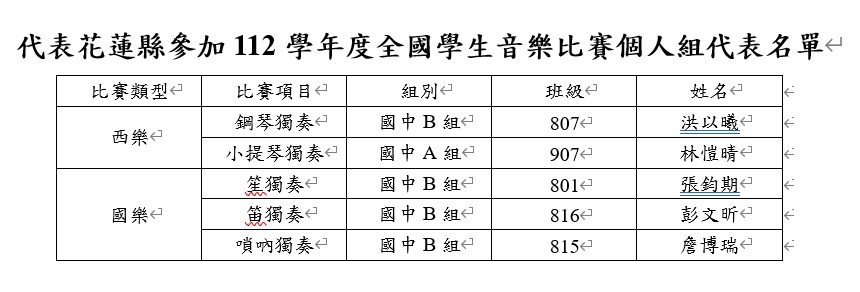 本校801張鈞期、807洪以曦、816彭文昕、815詹博瑞、907林愷晴代表花蓮縣參加112學年度全國學生音樂比賽個人組,恭喜以上同學。