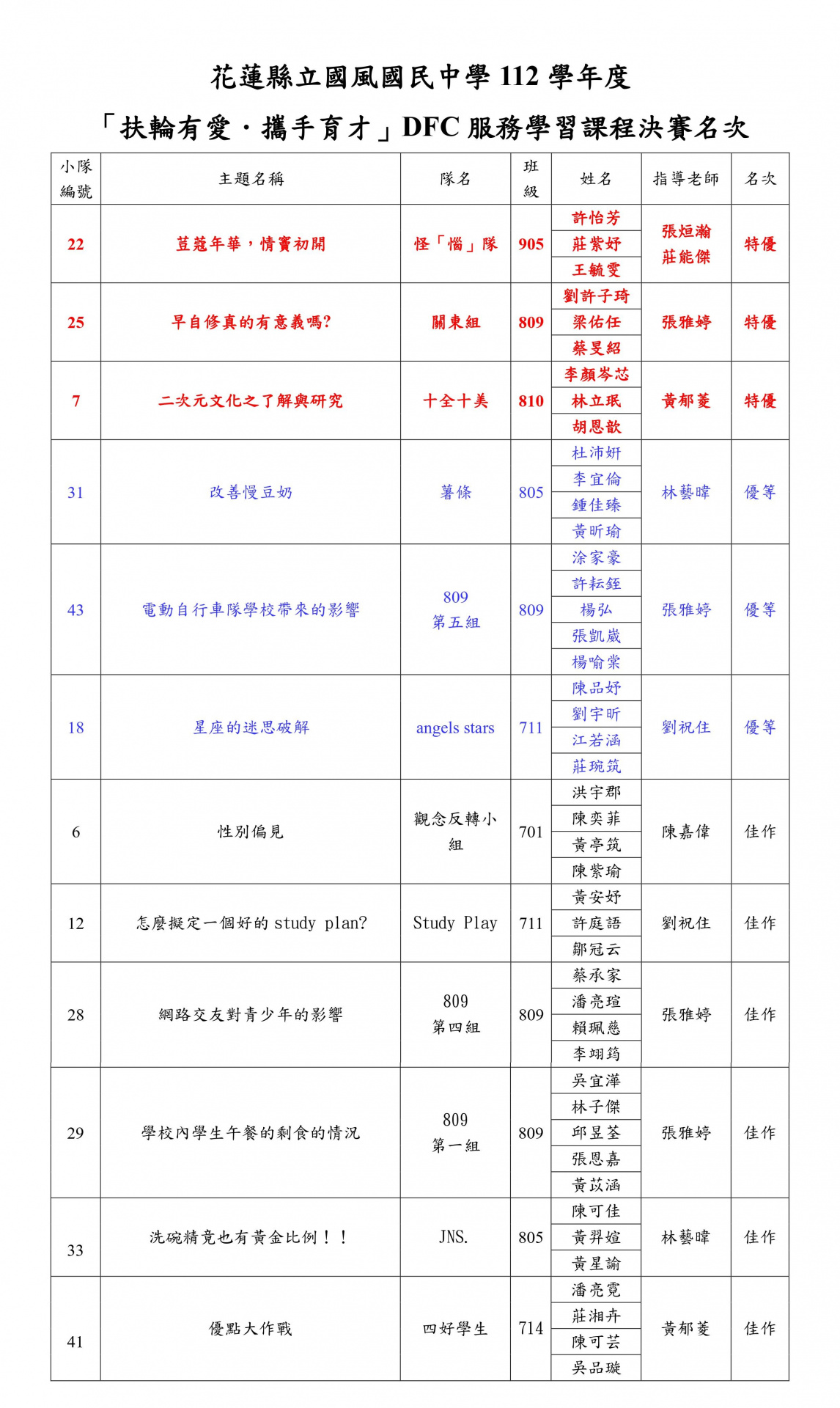 公告花蓮扶輪社社區服務「扶輪有愛.攜手育才」國風國中DFC服務學習課程比賽成績,恭喜獲獎同學,同時感謝花蓮扶輪社連續9年支持本校順利推展DFC課程。