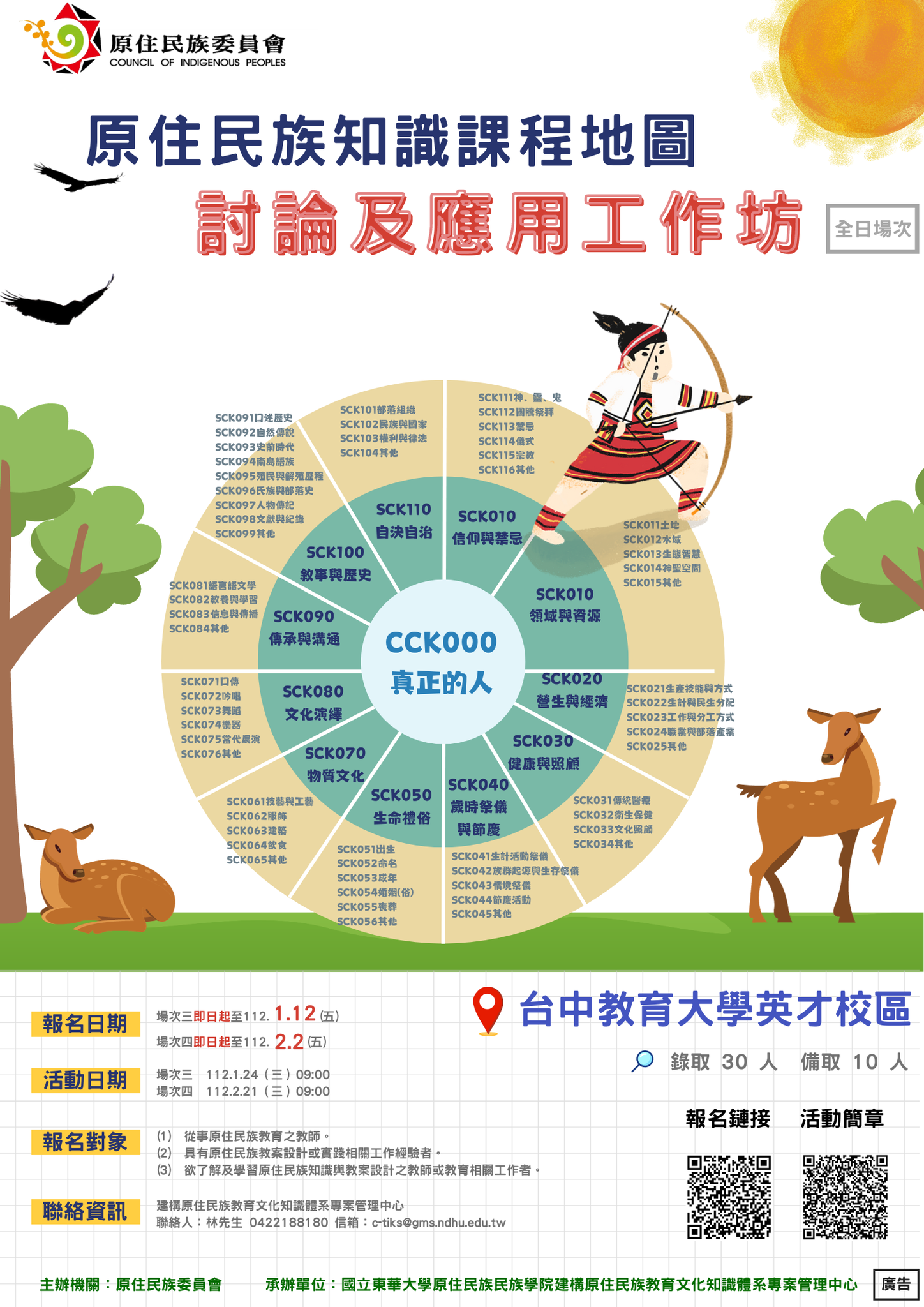 二、 | 活動辦理導入原住民族知識雲端平台系統應用與操作,藉 由資訊科技應用將國小、國中及高中不同學習階段進行原 住民族教育文化課程地圖之應用與討論,參與者可以獲得 資訊科技導入教育課程製作相關知能,並希望能有效轉化 為實務經驗或研究,以利推動原住民族知識課程發展以及 增能教師原住民族知識課程教學能量,鼓勵從事原住民族 教育之教師、相關學者或原住民教案設計實踐工作者,踴 躍報名。 |