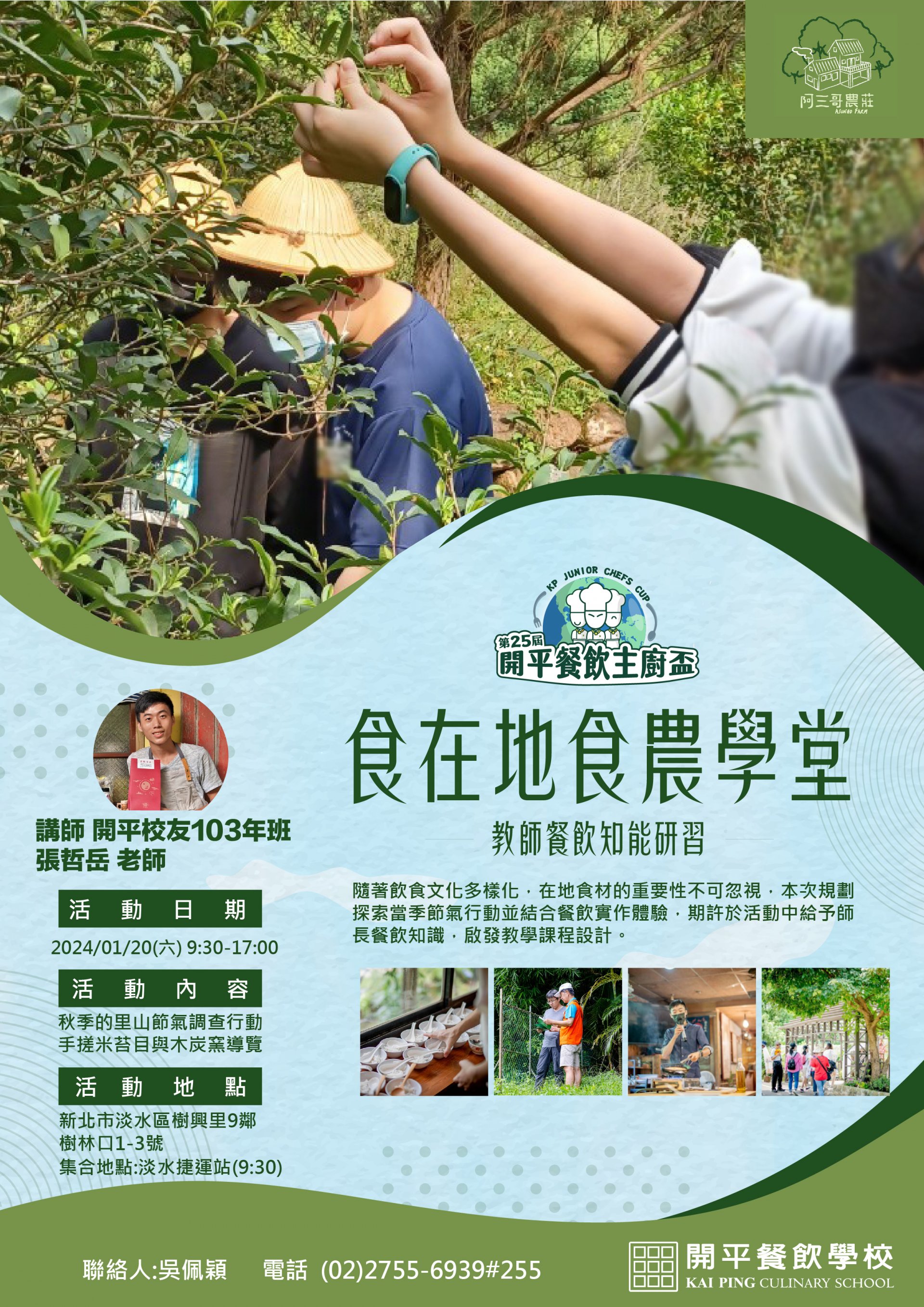 三、 | 報名方式:採線上報名,請上”全國教師在職進修資訊網”報名,課程名稱:食在地食農學堂-教師餐飲知能研習,課程代碼: 4135420 。報名截止日期: 2024/01/17,課程名單將於開課前三天確認遴選名單。 |