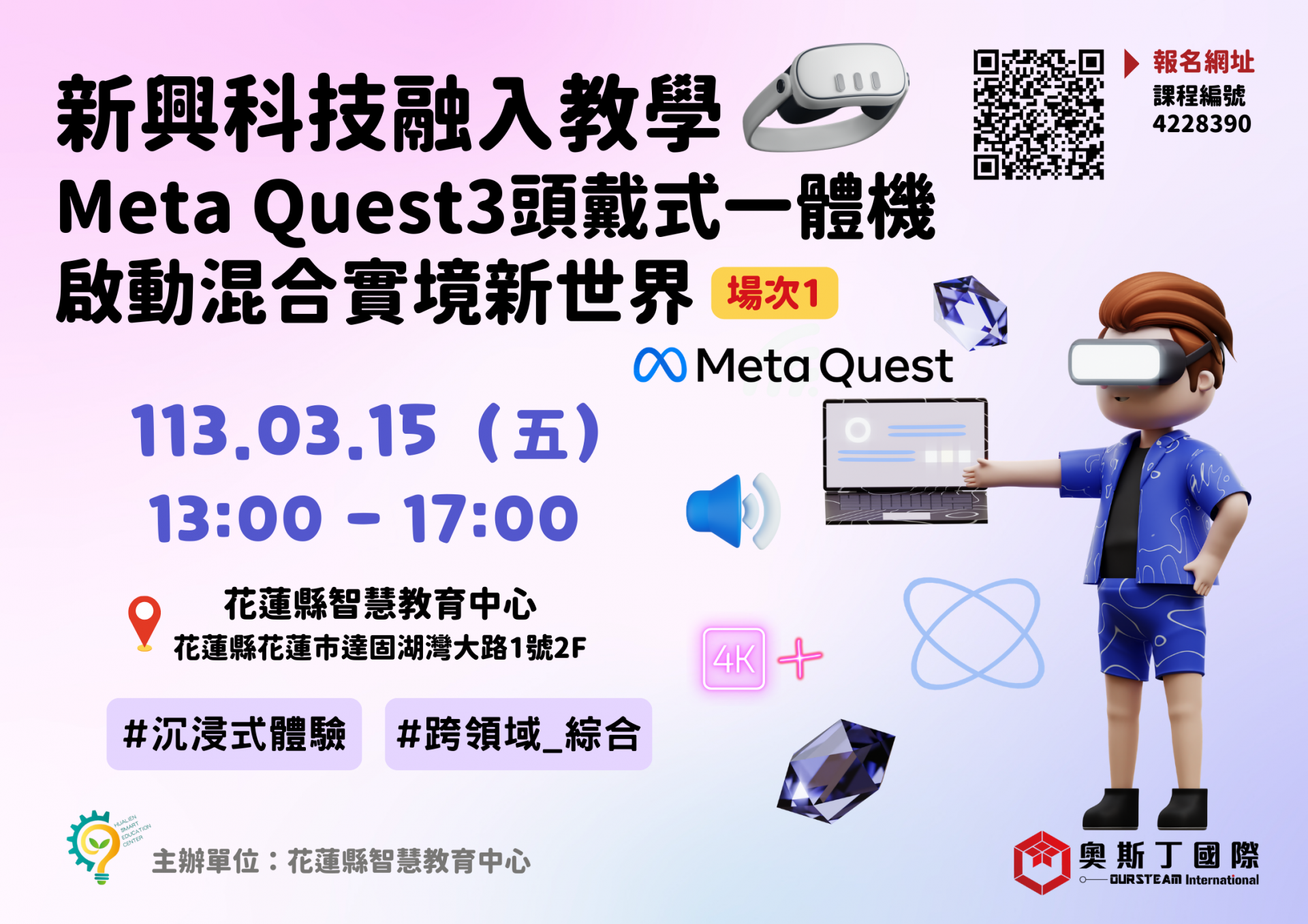 二、 | 旨揭研習為增進本縣國民中小學數位學習能力,提升教師運用數位科技及資源實施教學之能力,透過 Meta Quest3 頭戴式虛擬實境一體機實際操作混合實境模式並發展沉浸式體感教學內容,研習資訊如下(共辦理 2 場次;第 1 場次為基礎操作及混合實境體驗、第 2 場次為混合實境體驗及相關教學應用。): |