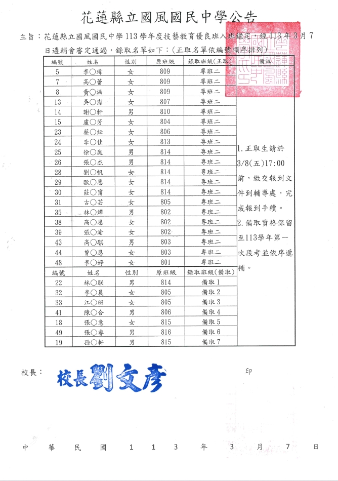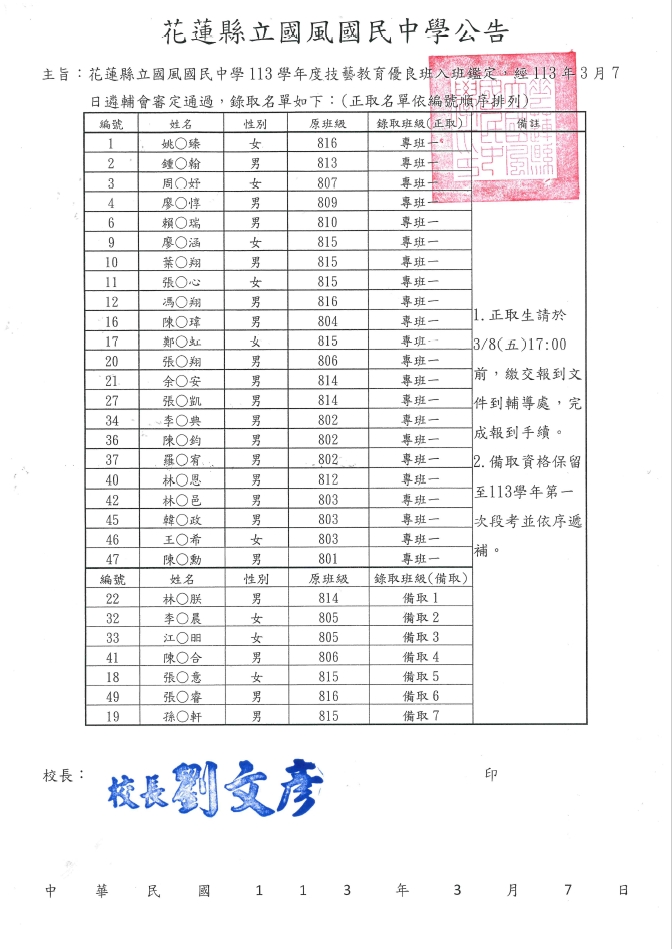 一、 113 學年度九年級技優班入班鑑定錄取名單如下方附件