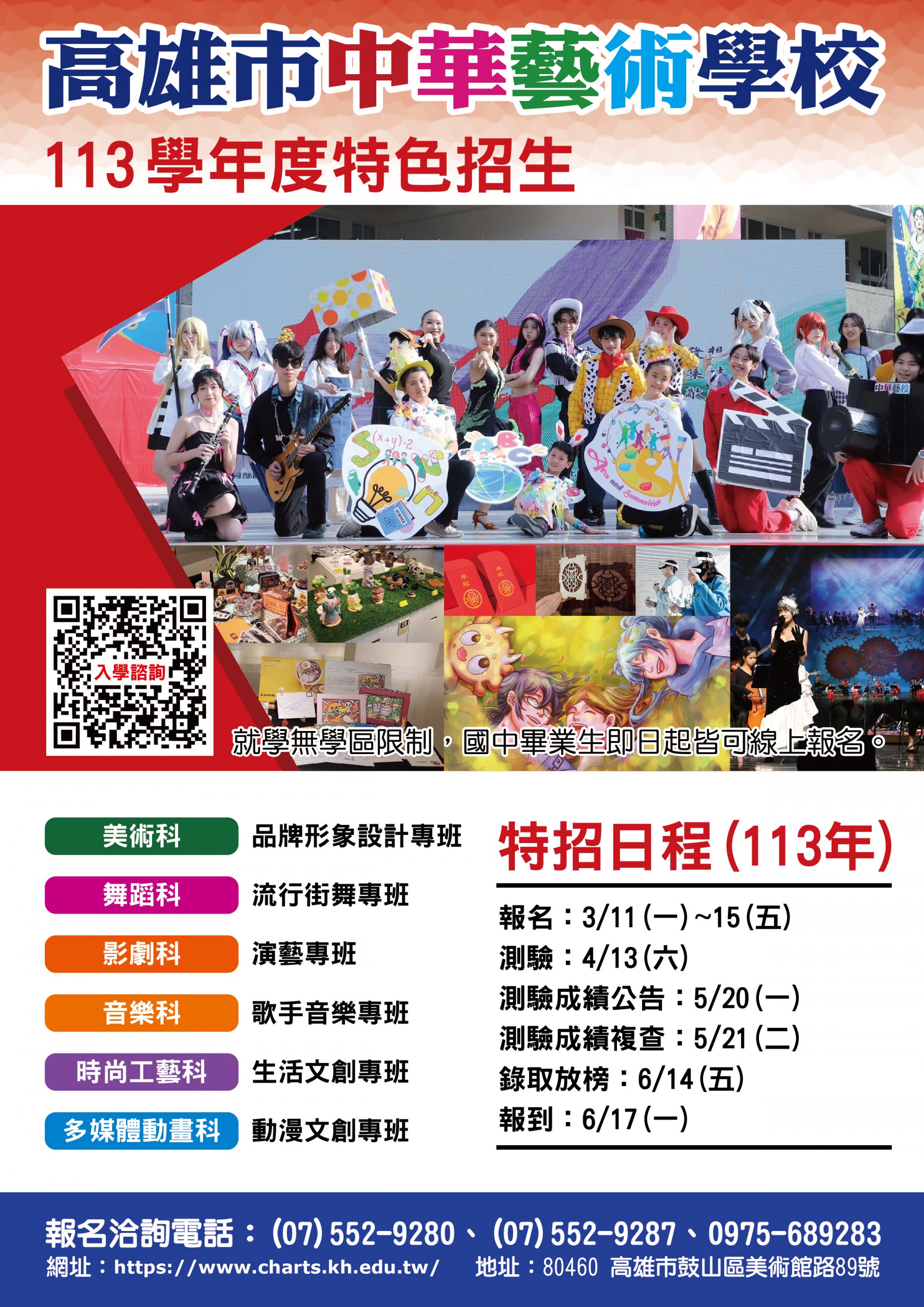 一、高雄市私立中華高級藝術職業學校113 學年度特色招生將於 113 年 3 月 11 日至 3 月 15 日受理報名,招生科班計有美術科、多媒體動畫科、時尚工藝科、影劇科、音樂科及舞蹈科,相關資訊詳見招生 DM(如附件)。