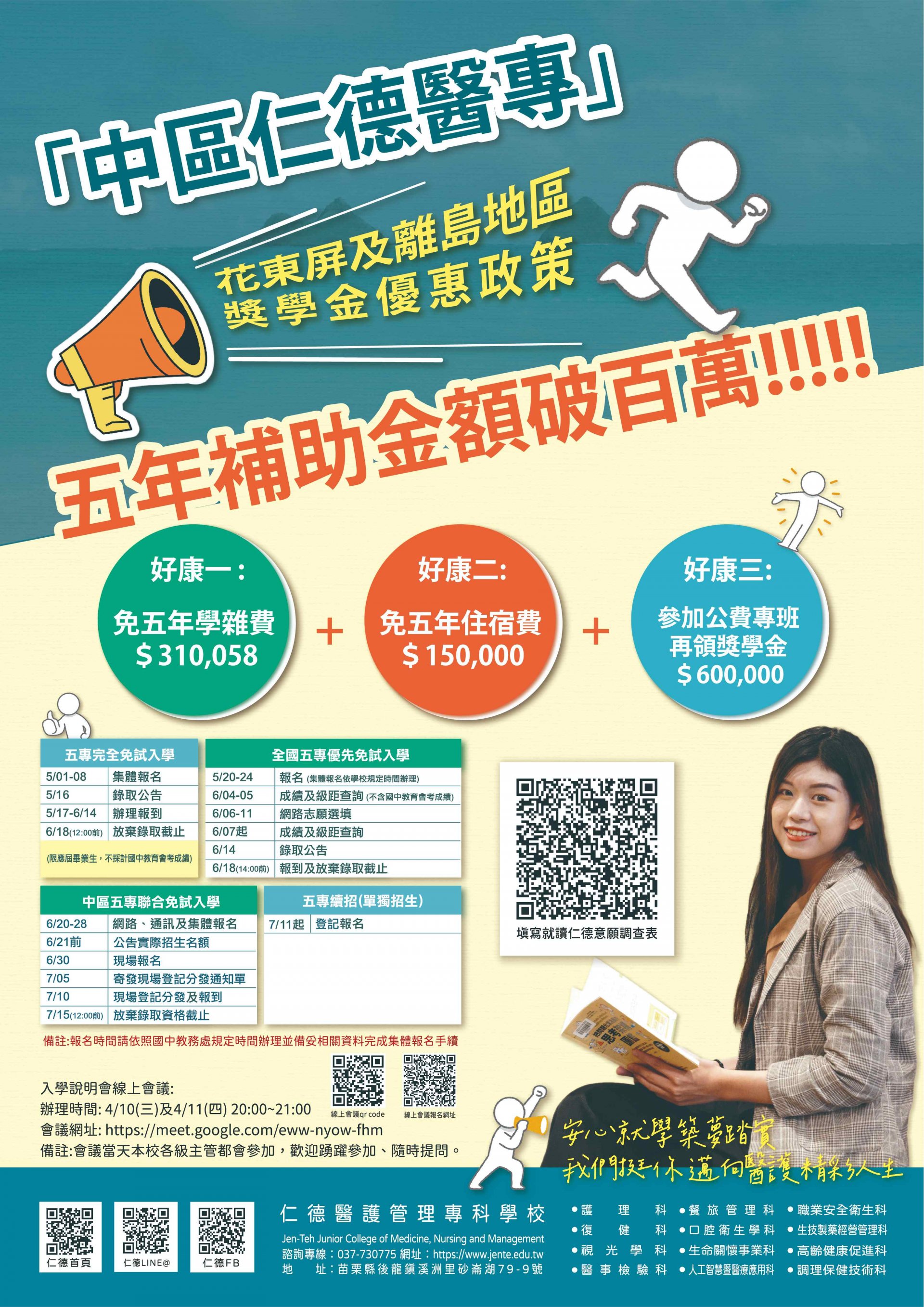 二、為使有意願就讀之學生及家長了解上述招生資訊及辦學特色,仁德醫護管理專科學校於 4/10(三)及 4/11(四)20:00~21:00 舉辦兩場次的線上說明會,邀請該校相關主管線上面對面提供諮詢服務。