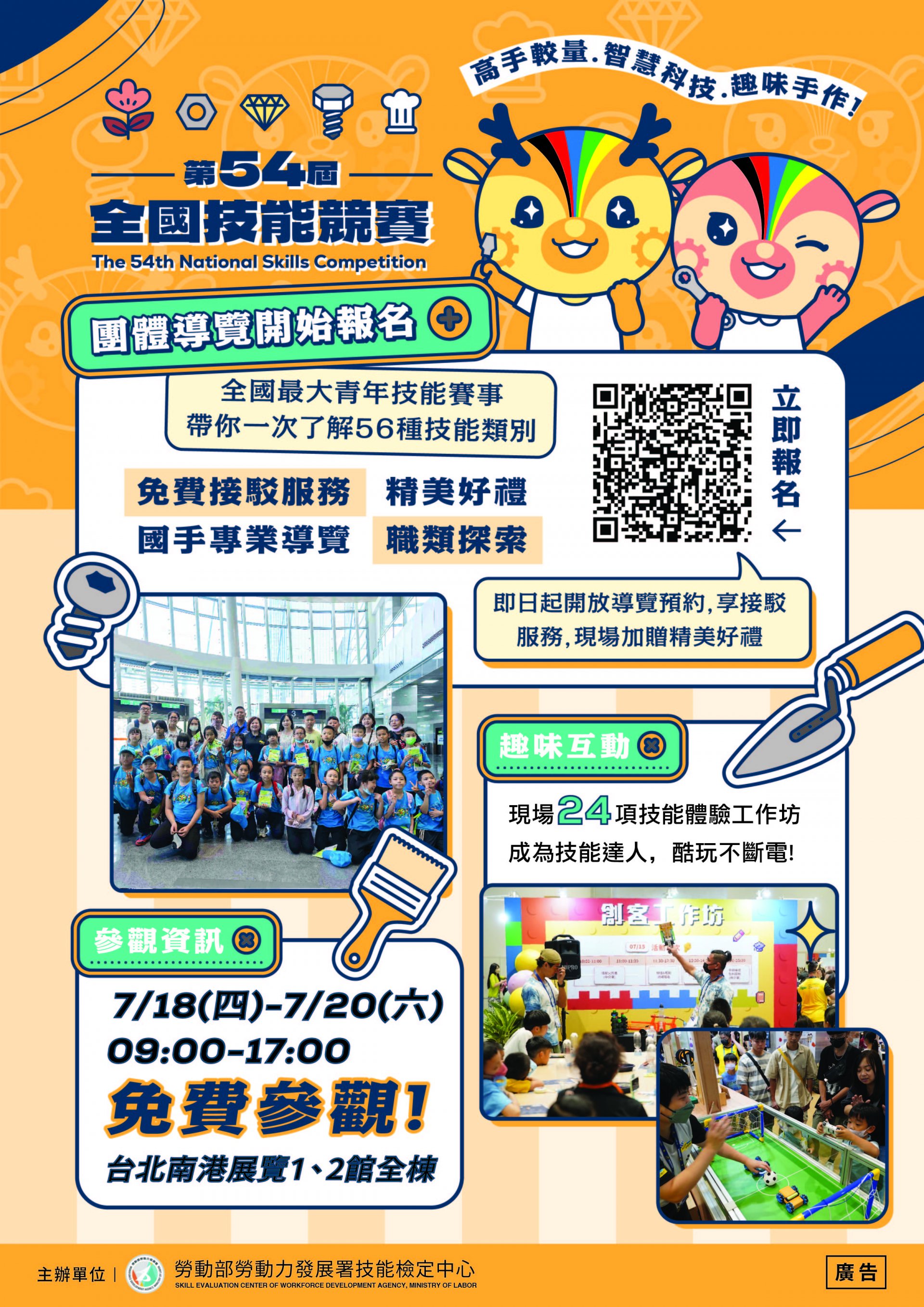 一、競賽活動訂於 113 年 7 月 18 日(星期四)至 7 月 20 日(星期六)假臺北市南港展覽館 1 、 2 館(臺北市南港區經貿二路 1 、 2 號)舉辦,本次辦理青年組 56 職類與青少年組 13 職類,共計 69 職類。