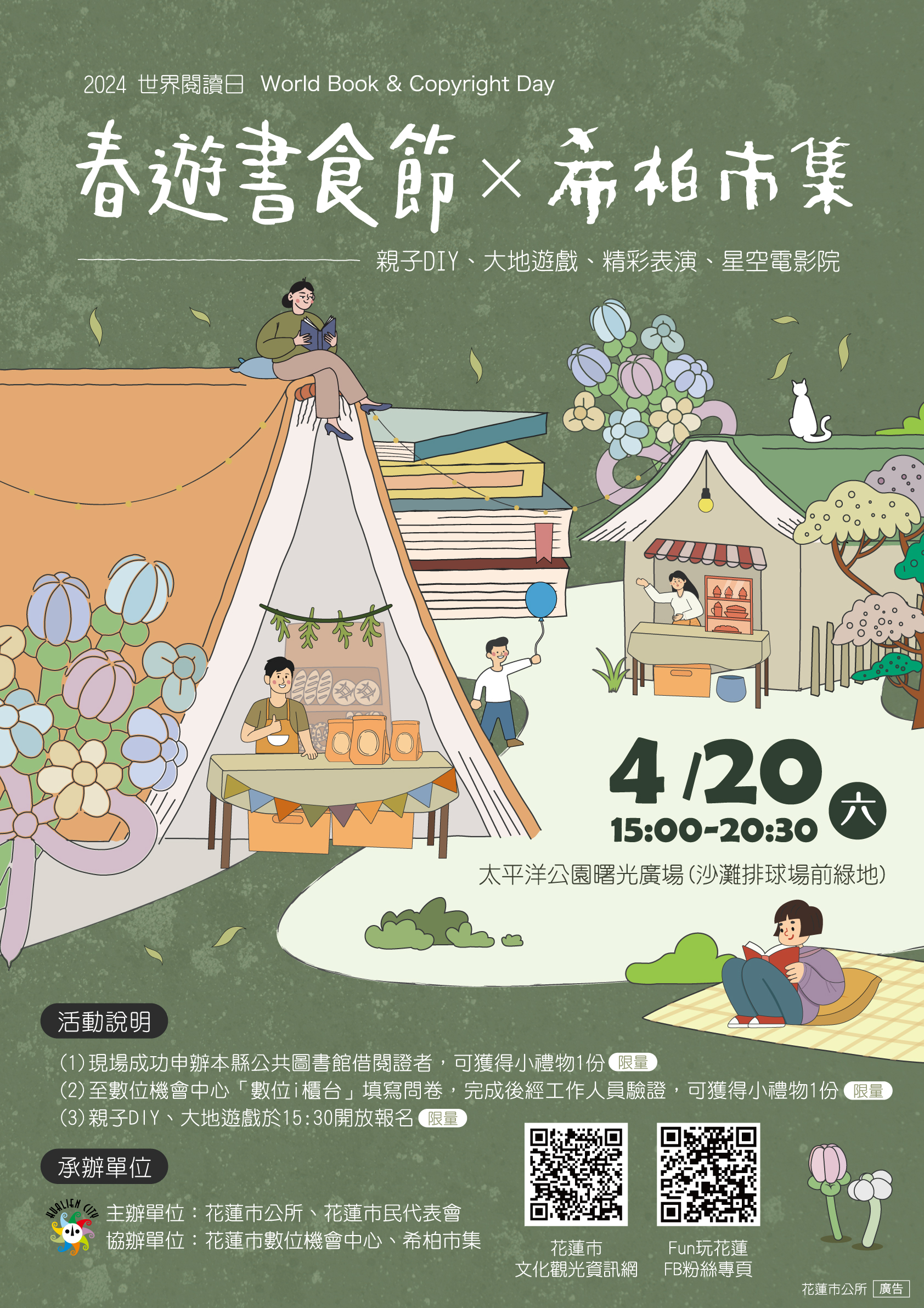 二、 | 為響應 4 月 23 日「世界閱讀日」,春遊書食節 X 世界閱讀日結合希柏市集,推廣閱讀習慣及美食,提升全民閱讀風氣,讓市民在假日來太平洋公園逛市集、看書展、野餐、欣賞電影,親子同樂春遊,以寓教於樂。 |
