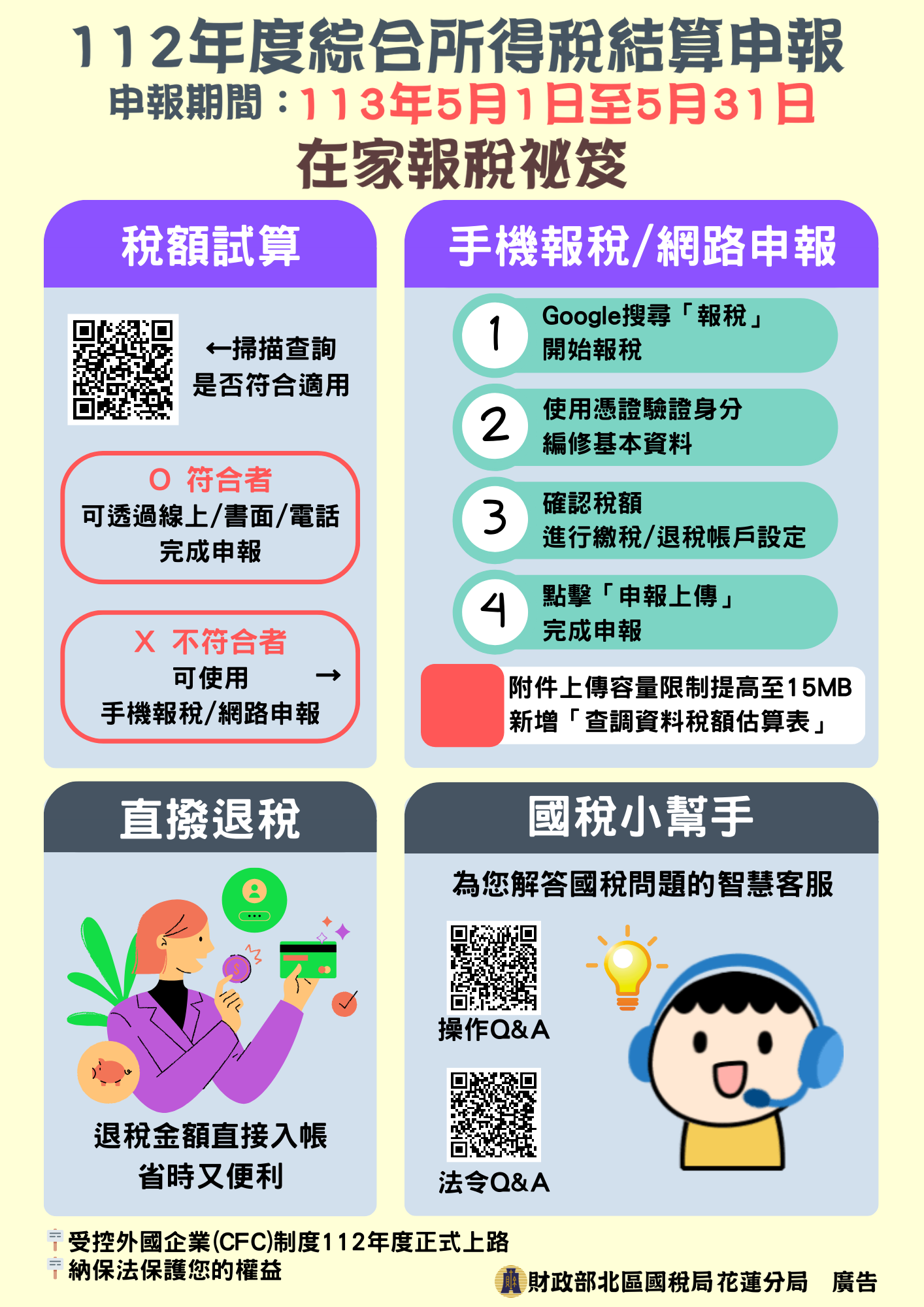 2.112 年度所得稅結算申報期間自 113 年 5 月 1 日起至 5 月 31 日止,請儘早申報,以免最後人多擁擠。