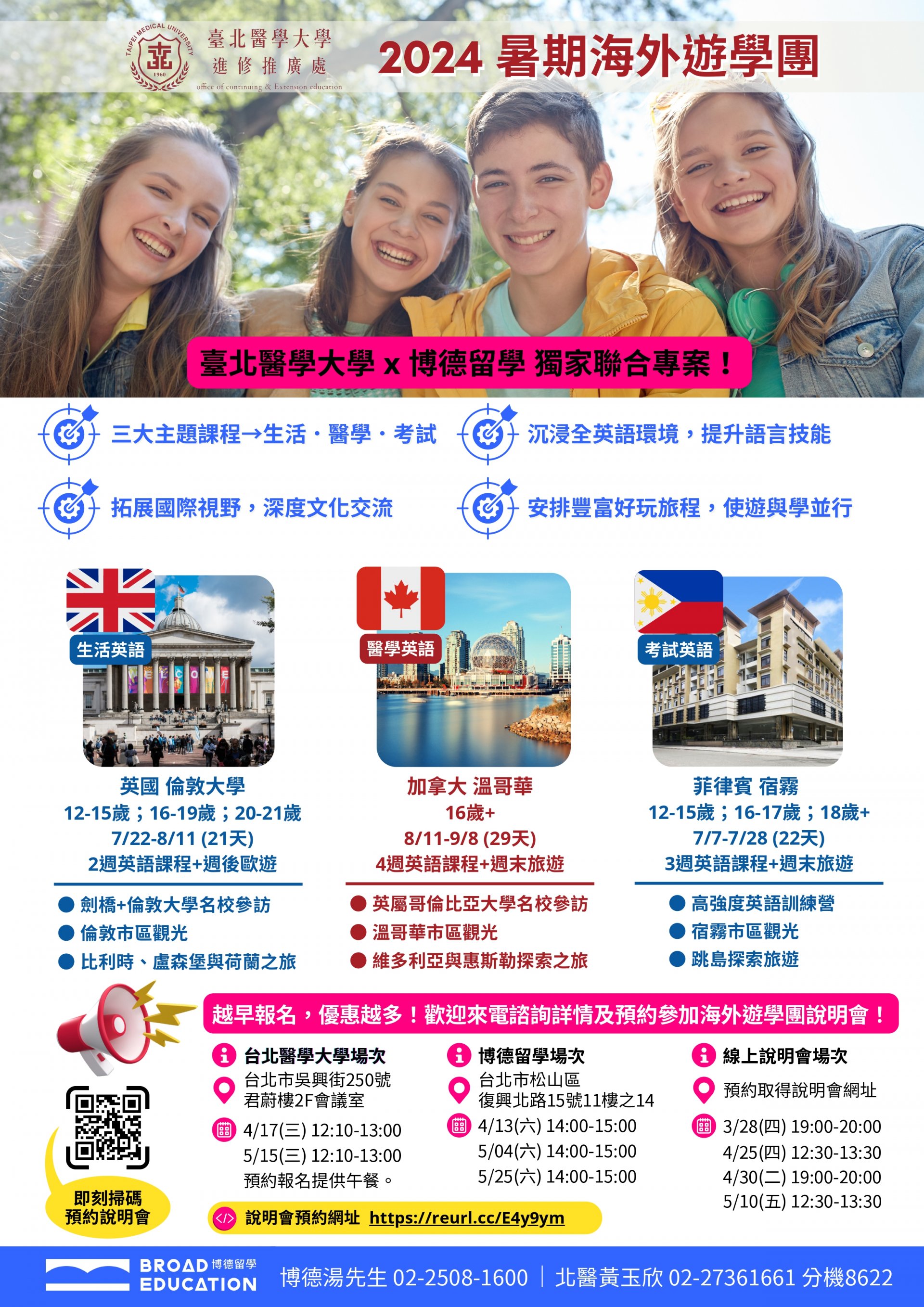 四、 | 本處可針對各校需求辦理營隊說明會,凡參與人數達 10 人,即可預約黃小姐到貴校進行實體或線上說明會,洽詢電話為 02-2736-1661#8622(yurihuang@tmu.edu.tw)黃小姐。 |