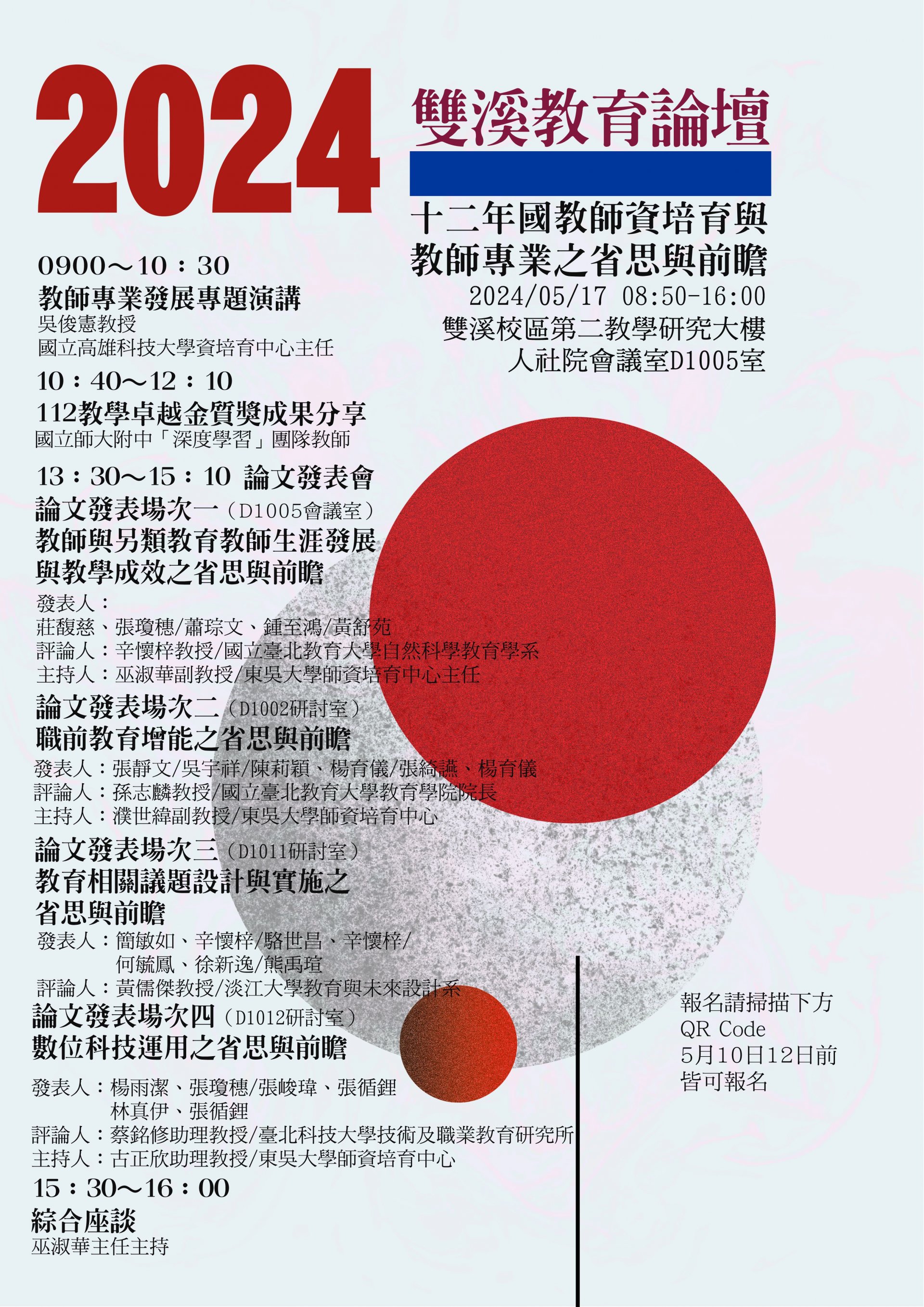 轉知東吳大學師資培育中心訂於113年5月17日辦理2024「雙溪教育論壇」學術研討會,請查照。