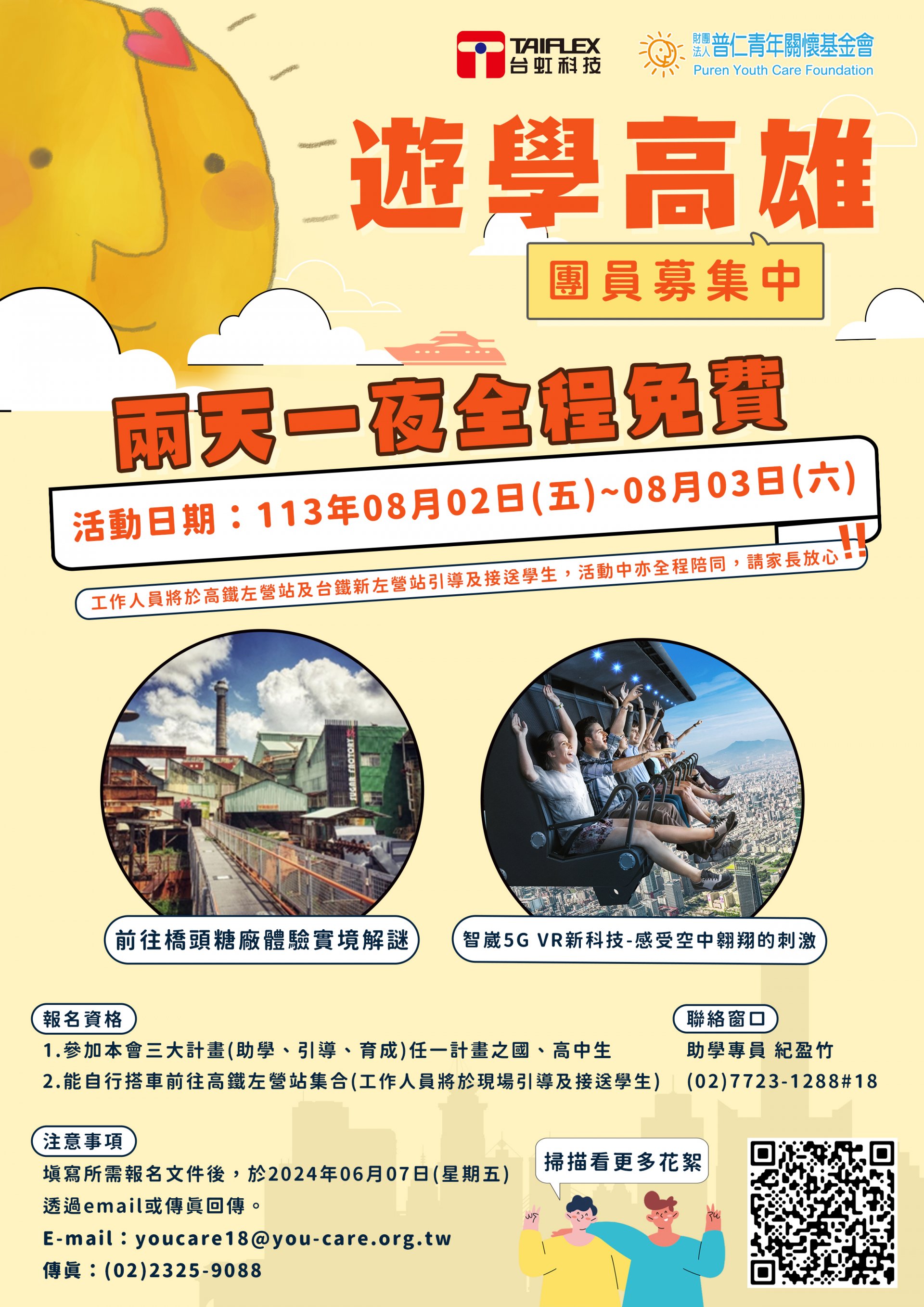 一、將於 113 年 08 月 02 日(五)至 08 月 03 日(六),舉辦 2024 年遊學高雄青少年體驗活動,費用全免,凡參與本會助學計畫、引導計畫或育成計畫之國、高中學生,皆可報名。