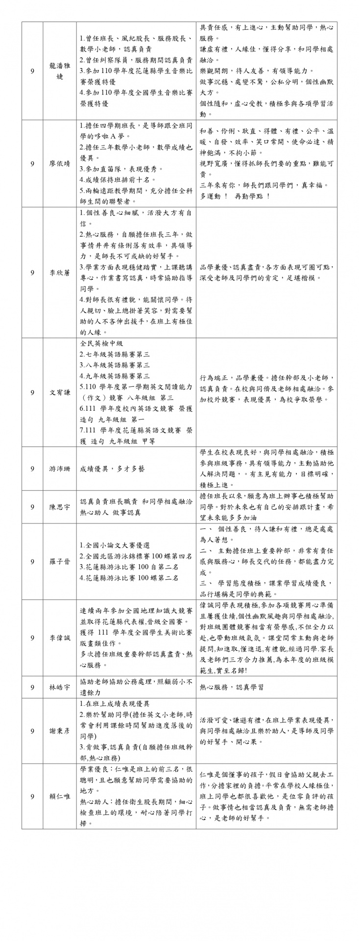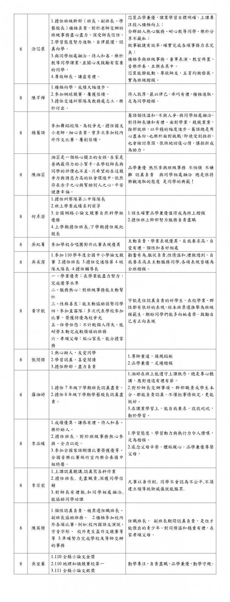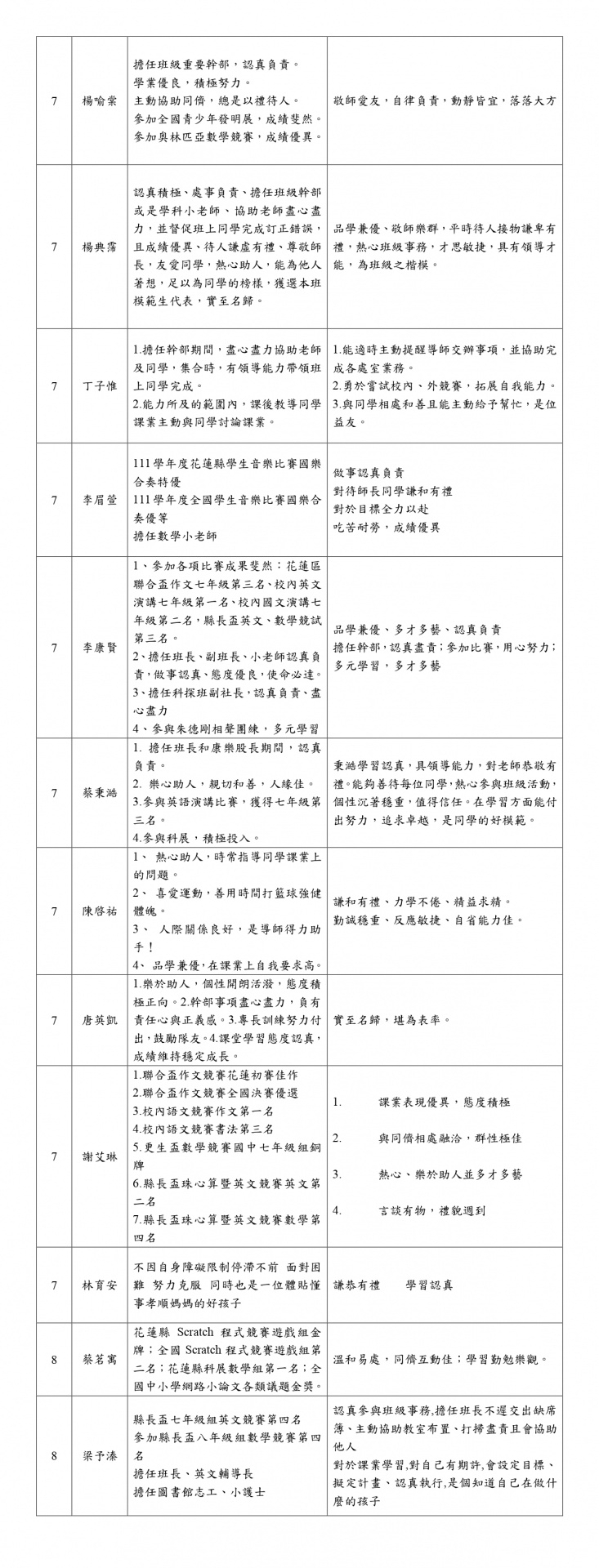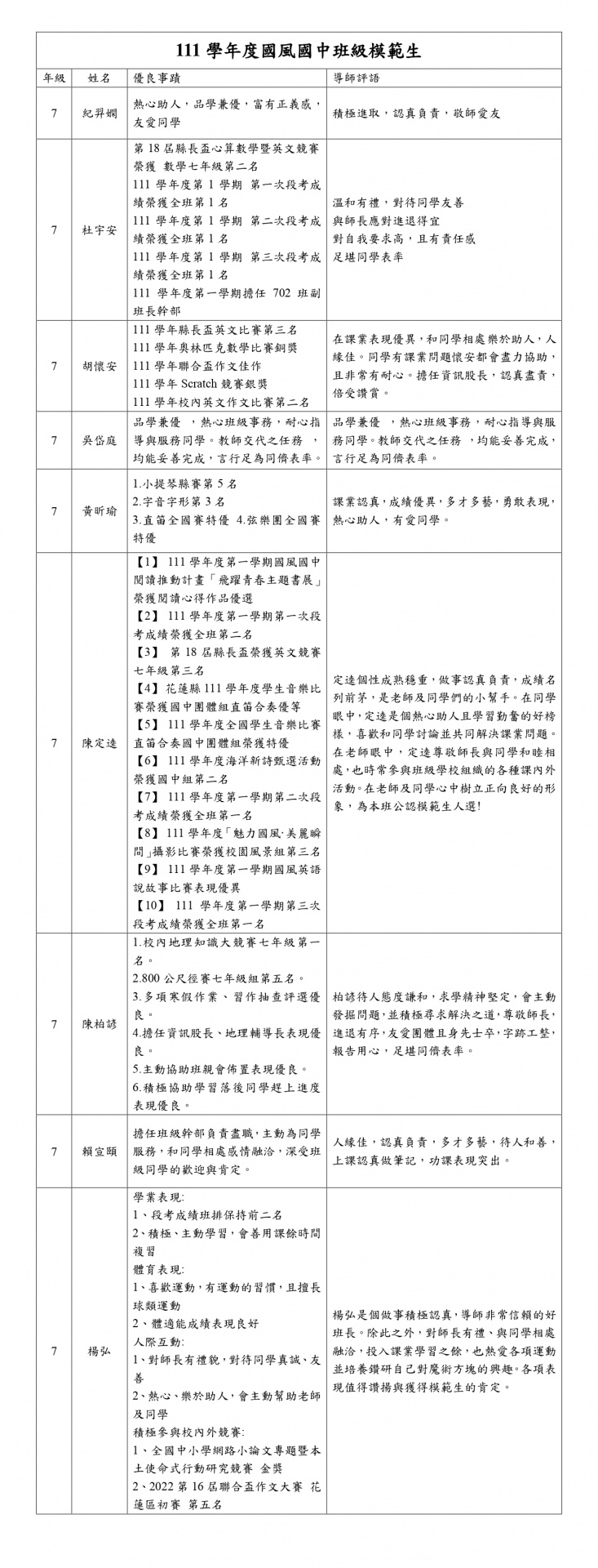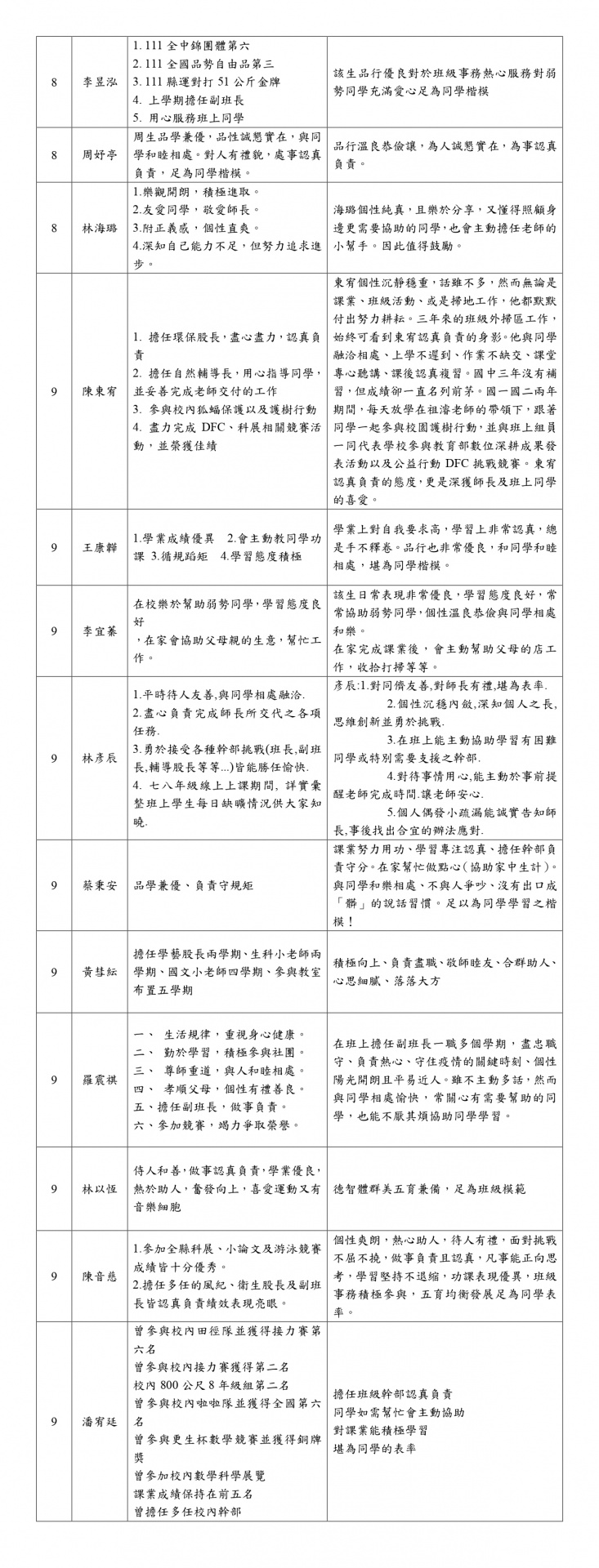 111學年度模範生獲獎名單,恭喜獲獎同學。