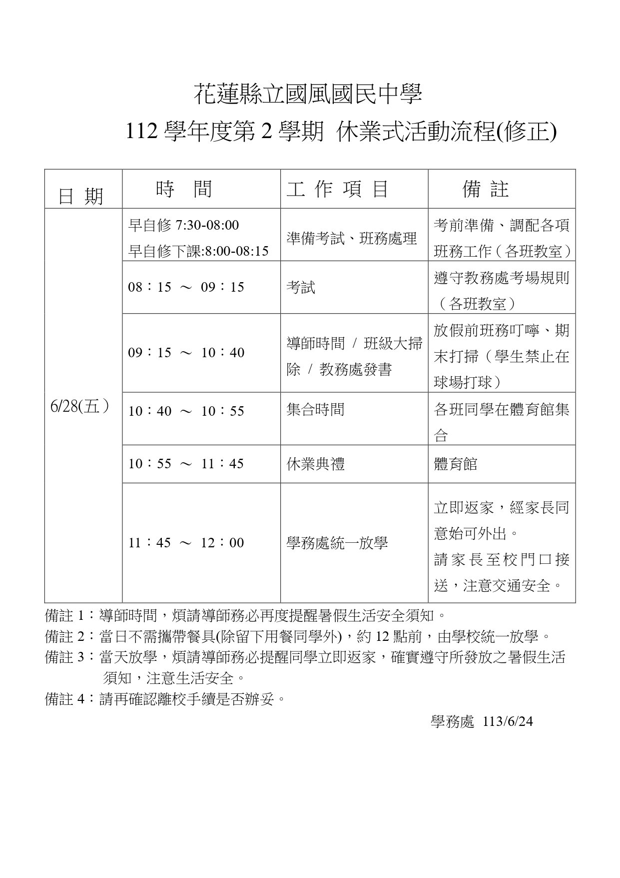 112學年度第二學期休業式流程(113.06.24修正),請參閱。