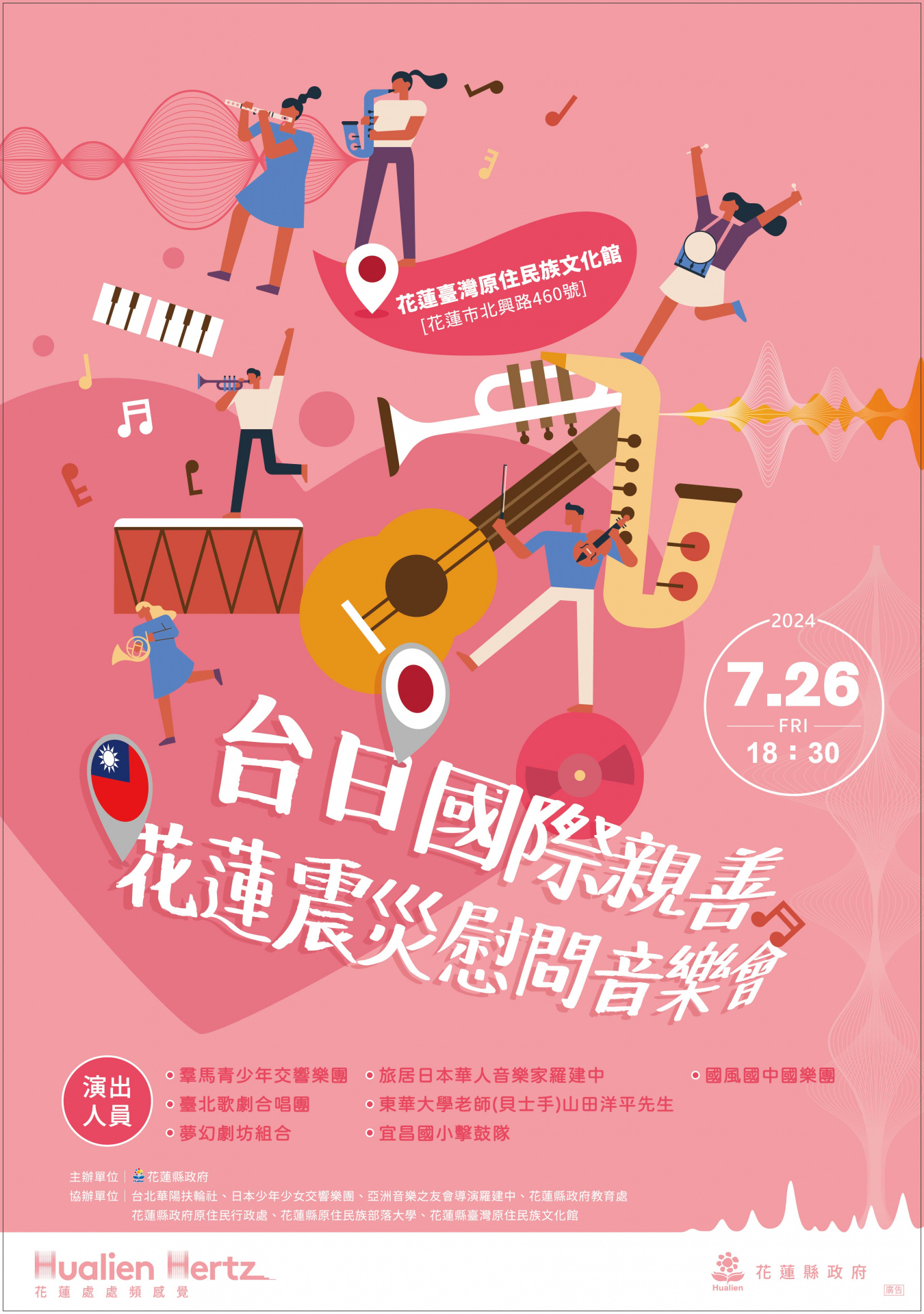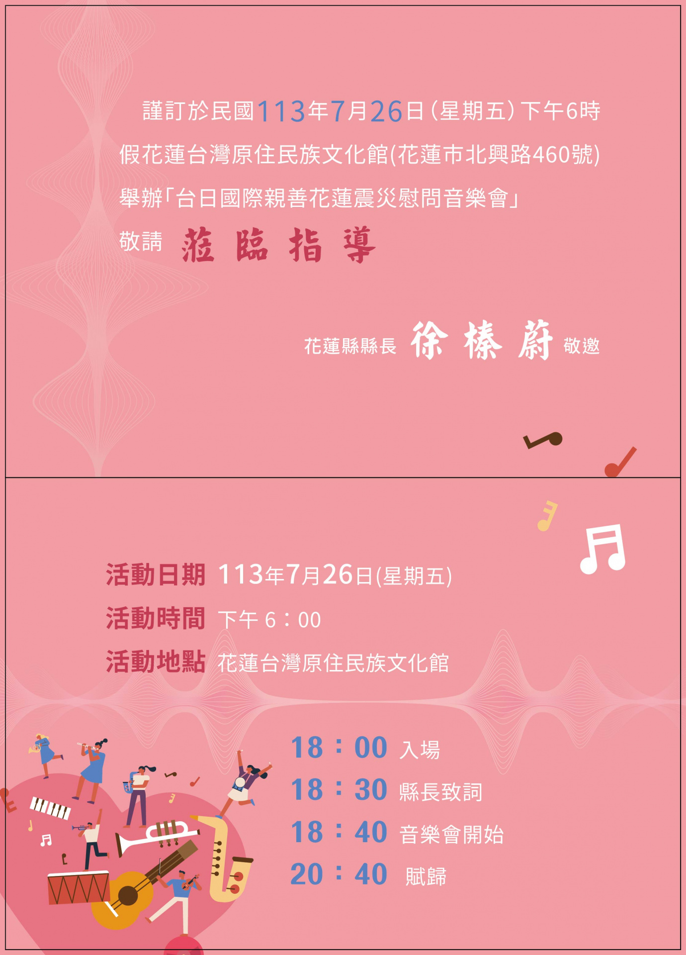 花蓮縣政府辦理台日國際親善花蓮震災慰問音樂會,因颱風緣故,本次活動取消。