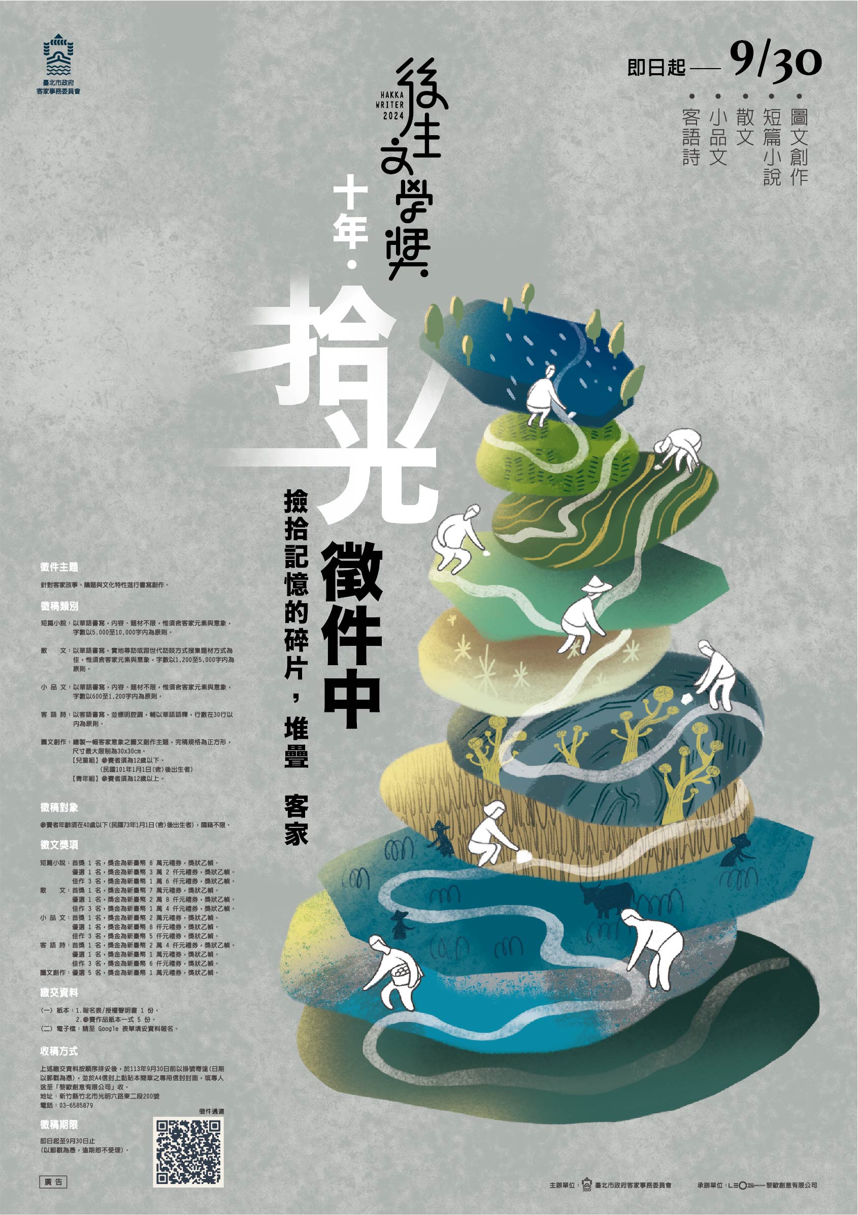 二、 | 為鼓勵青年以客家故事進行書寫,深化後生與原鄉客家的 情感鏈結及族群文化認同,該會特辦旨揭徵文活動,參賽者須在 40 歲以下(民國 73 年 1 月 1 日(含) 後出生者),國籍不限,徵稿期限延長至 113 年 9 月 30 日止,相關內容詳如附件簡章。 |