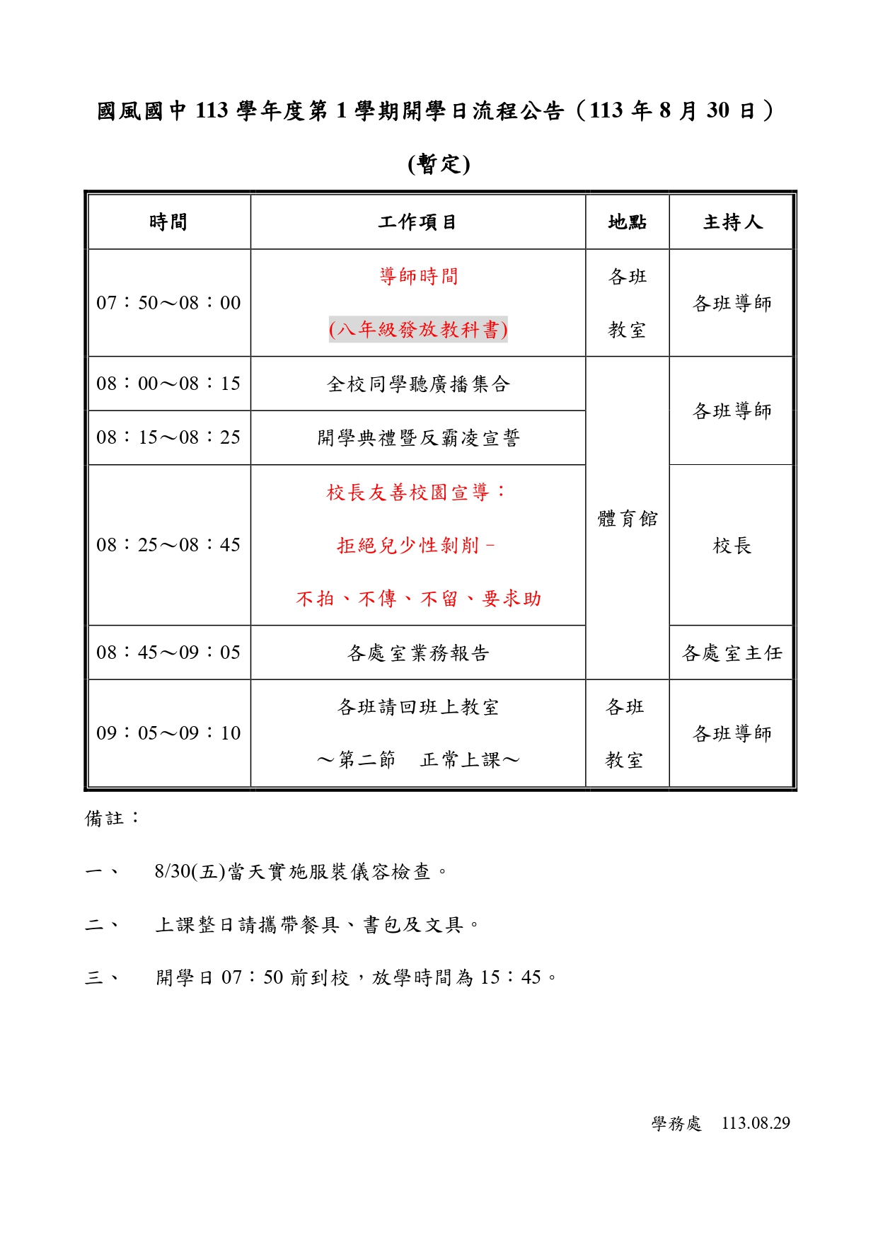 國風國中113學年度第1學期開學日流程,請師長、家長以及同學參閱。