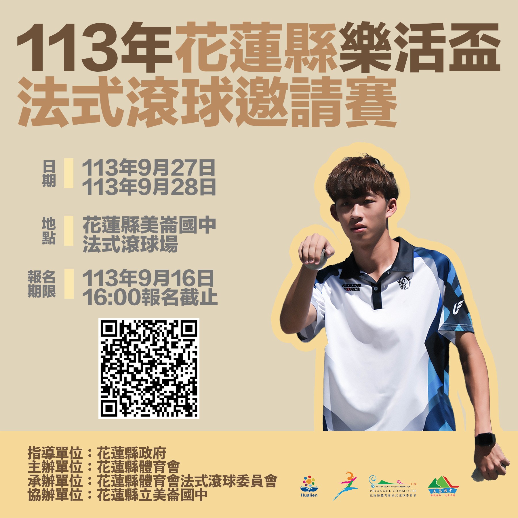 花蓮縣體育會辦理「113 年花蓮縣『樂活盃』法式滾球邀請賽」有意願參加者,請於 113 年 9 月 16 日(一)中午 12 點前至本校體育組報名。