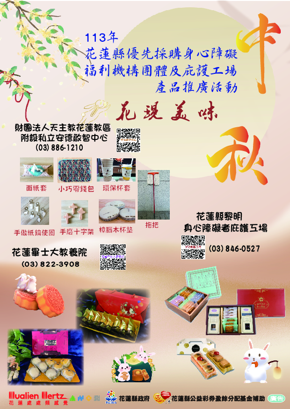 為推廣花蓮縣身心障礙福利機構團體及庇護工場所生產之秋節產品,惠請貴單位或轉知所轄機關參考選購,請查照。