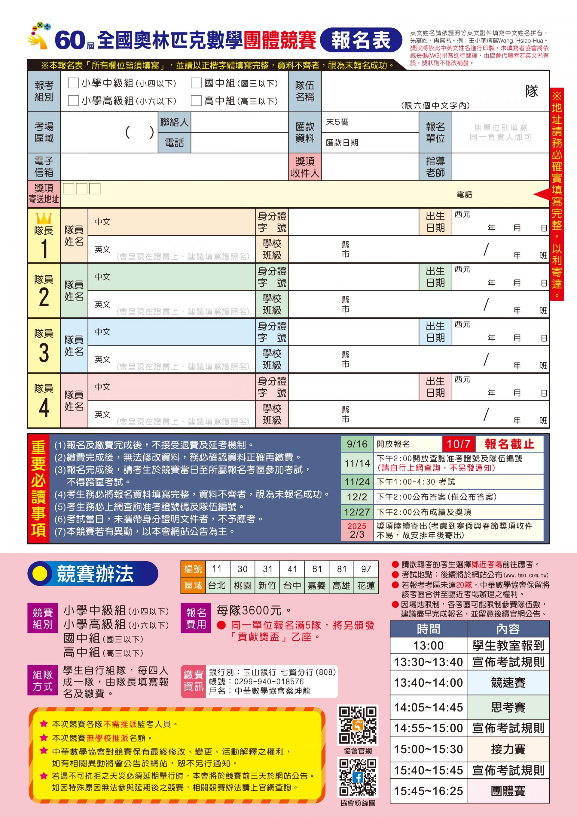 檢附「第 60 屆全國奧林匹克數學團體競賽」競賽活動相關簡章,供 貴校參閱。競賽報名的起訖時間為 113 年 9 月 16 日至 113 年 10 月 7 日止。