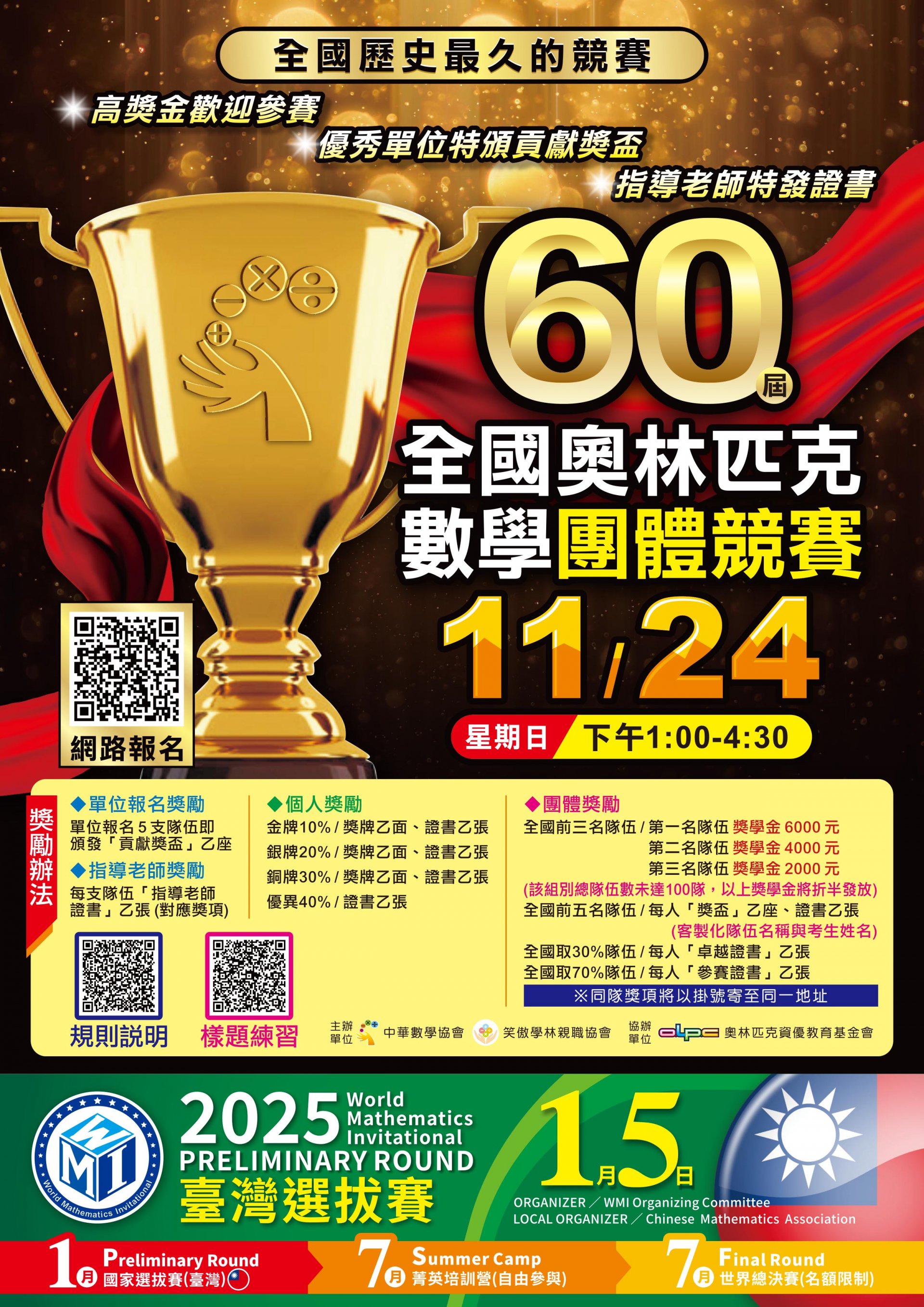 本會為推廣國小、國中至高中之數學教育,謹訂於113年11月24日(日)舉辦「第60屆全國奧林匹克數學團體競賽」,旨在培養學生對數學的興趣,為國家培育優秀人才。建請 貴校公告並鼓勵學生參加競賽,以提升數學教育,歡迎共襄盛舉。