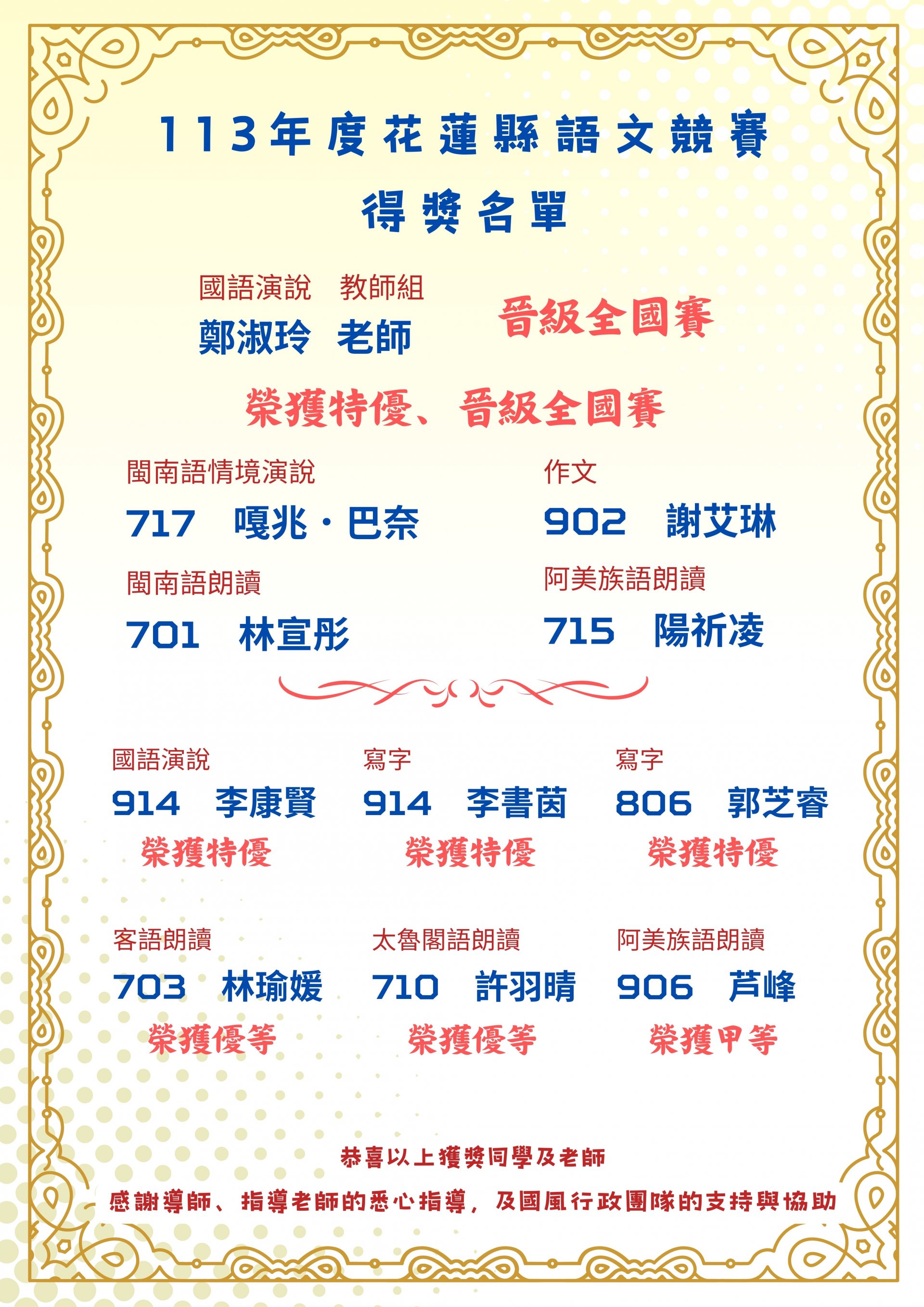 太魯閣語朗讀 710 許羽晴榮獲優等