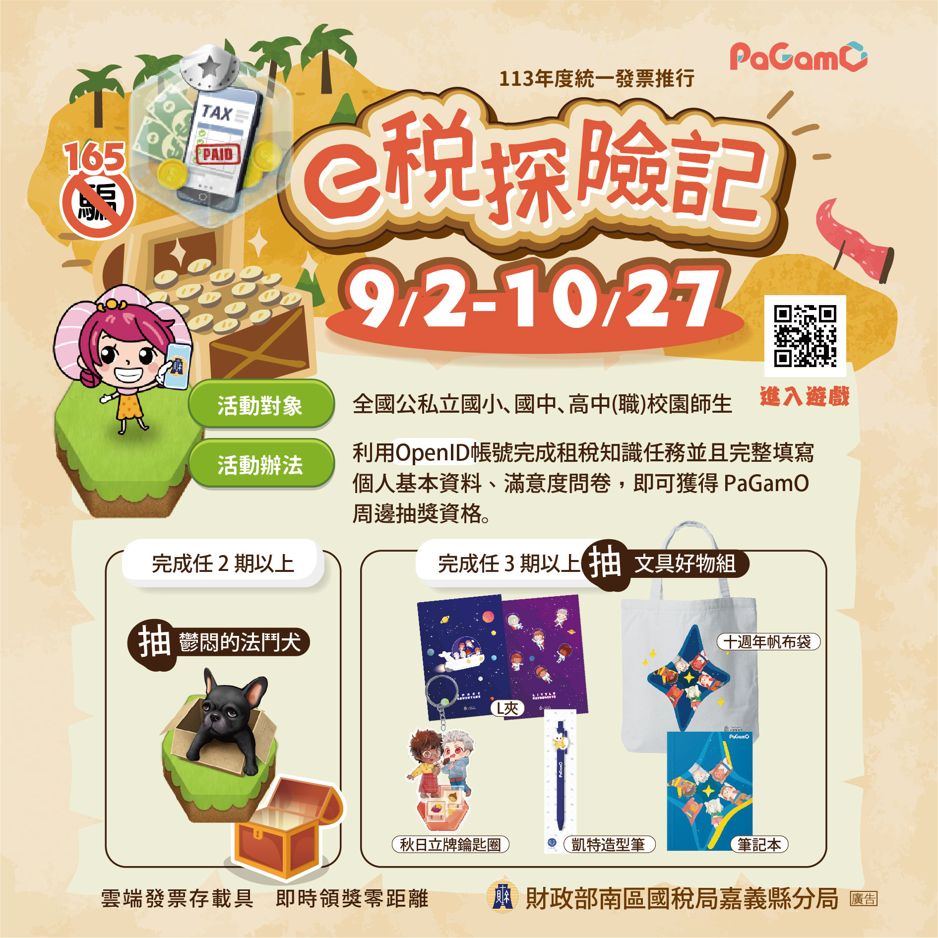 四、活動辦法:校園師生在活動期間內利用 Open ID 登入 PaGamO 線上遊戲學習平台,再至任務書點選「世界任務」,選擇「e 稅探險記」任務書,完成任一主題任務(有雲端發票、反詐騙、性別平等、廉能政策總計 4 檔期任務),任務完成可獲得任務限定「虛擬寶物-E 稅載具」作為任務獎勵。