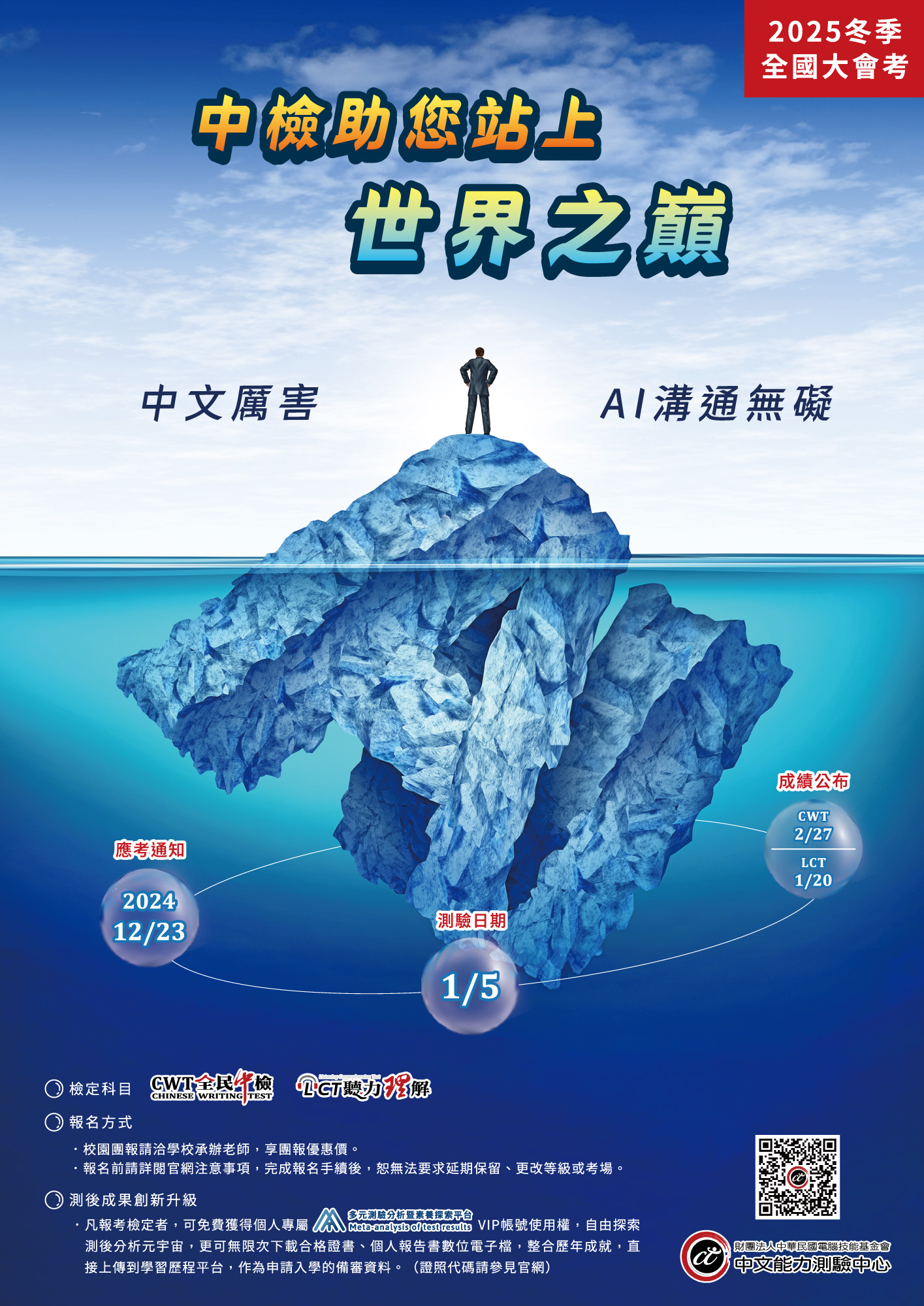 一、 | 「CWT 全民中檢」、「LCT 中文聽力理解檢定」為全國唯一通過教育部民間推薦採認之中文類證照,亦於「全國高級中等學校學生學習歷程資料庫」認列為多元表現之證明,將有助貴校學生升學備審。證照代碼如下:甲、 CWT 全民中檢證照代號: 初等 9110 、中等 8021 、中高等 7979 、高等 7863 及優等 7896 。乙、 LCT 中文聽解證照代號: 酷紅級 9111 、白金級 9112 、鈦金級 9113 及星鑽級 9114 。 |