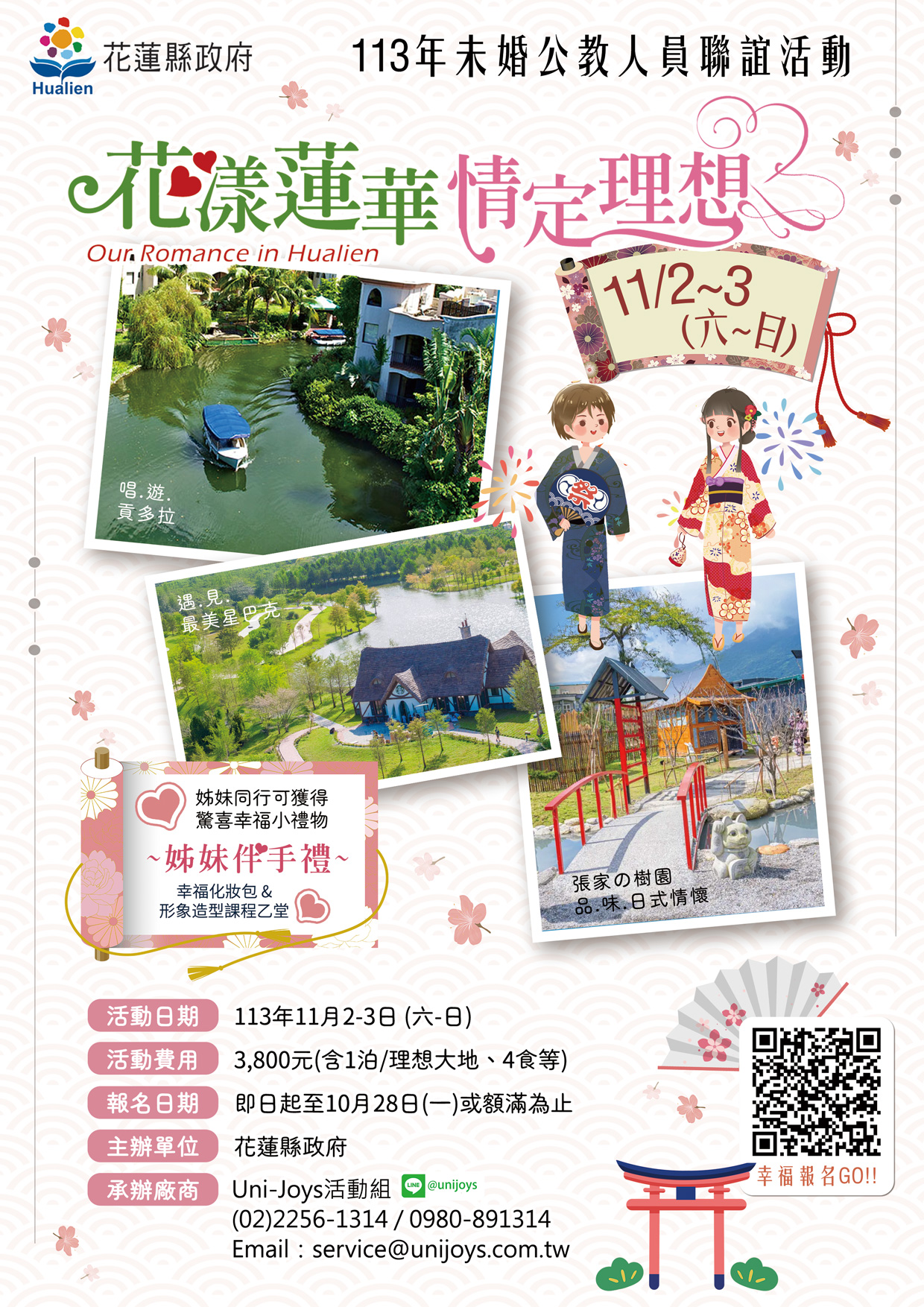本府訂於113年11月2日、3日(星期六、日)辦理「花漾蓮華情定理想公教人員未婚聯誼活動」,敬請轉知所屬未婚同仁踴躍報名參加,請查照。