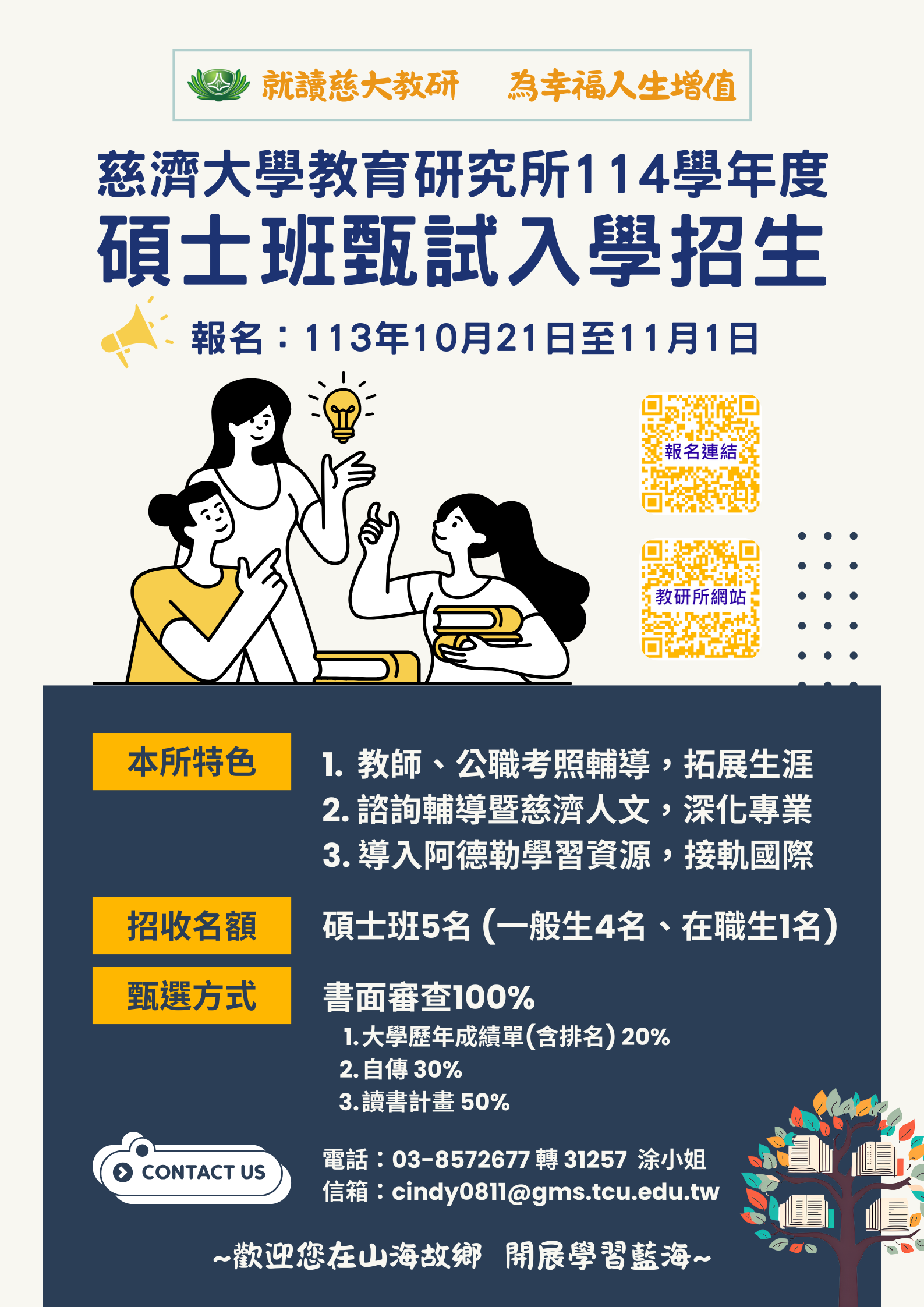 慈濟大學檢送教育研究所114學年度甄試入學資訊,敬請查照並惠予協助公告