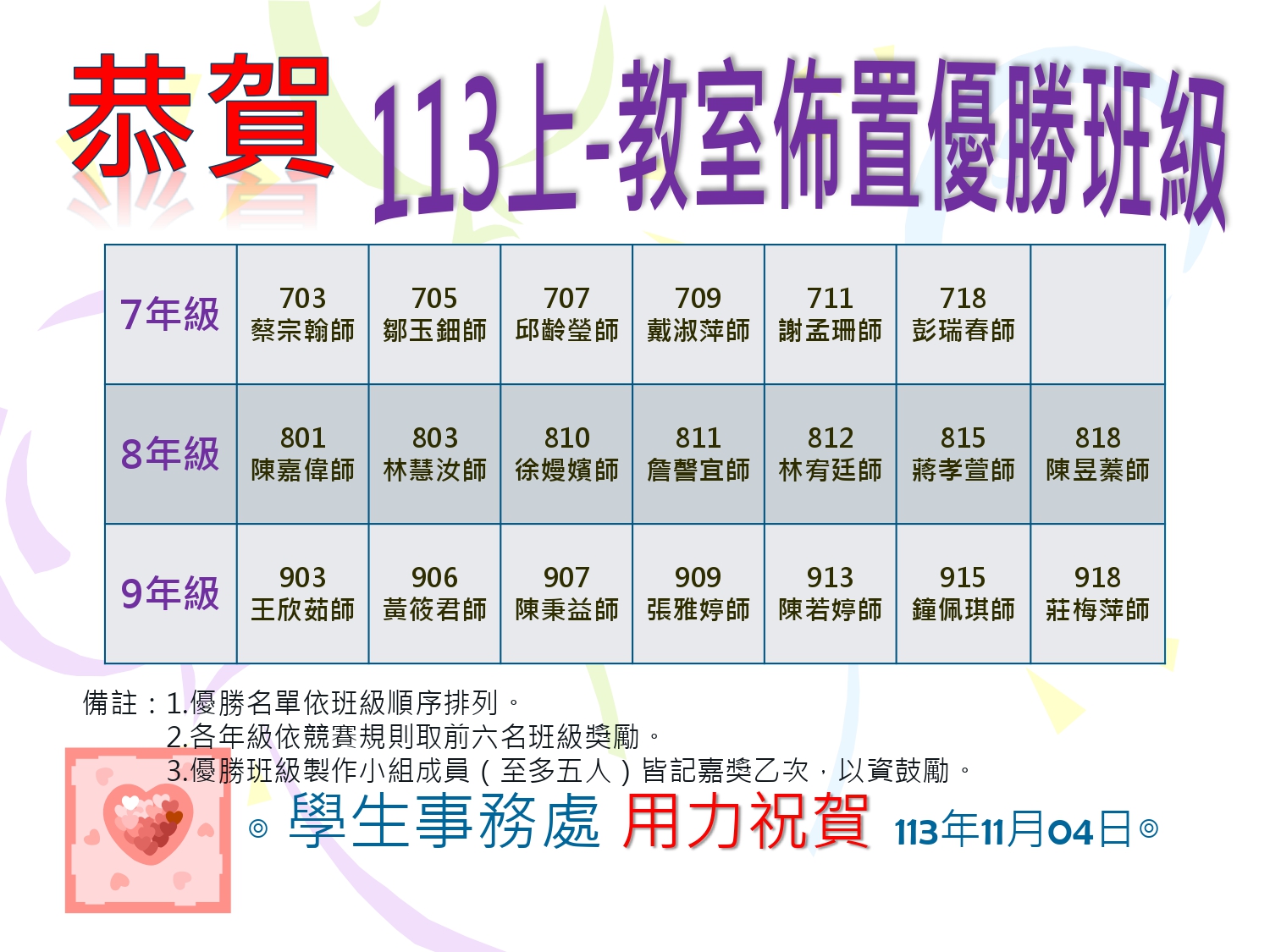 113學年度第1學期教室佈置競賽優勝班級,恭喜獲獎班級。