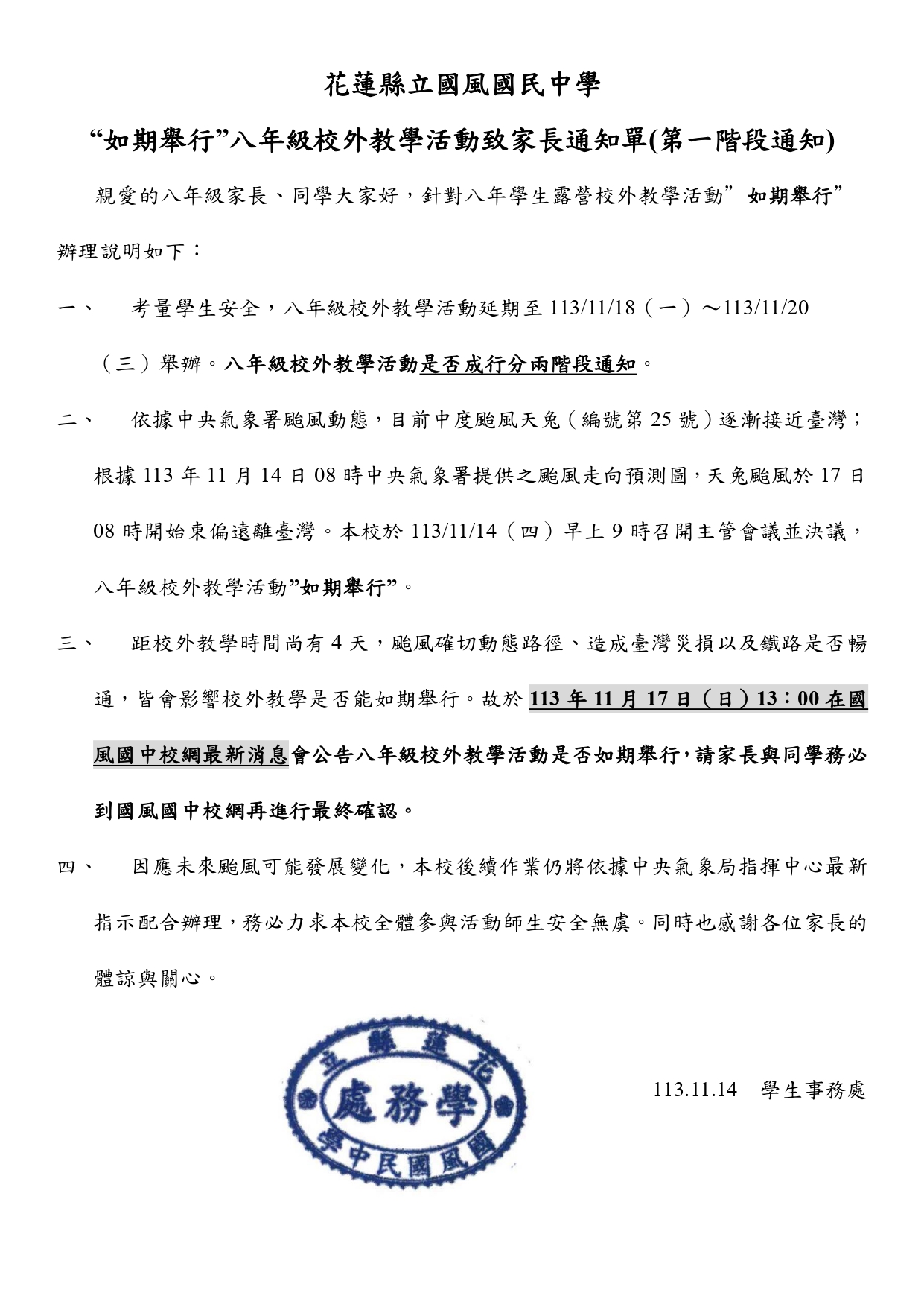 (第一階段通知)113學年度八年級校外教學於113年11月18日(一)至11月20日(三)如期舉行,因天兔颱風來襲,請家長與同學於11/17(日)13:00前再到校網最新消息再行最後確認,詳情請見內容。