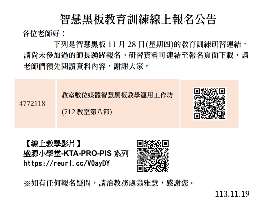 各位老師好: 有關班級智慧黑白板 11 月 28 日(星期四)的教育訓練研習,請尚未參加過的師長踴躍報名。