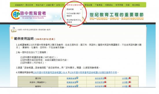 三、 | 前述網站除說明各項特殊應考程序,亦提供「語音報讀」及「NVDA 試題本電子檔」範例,請各校教師協助考生熟悉操作方式並練習使用。 |