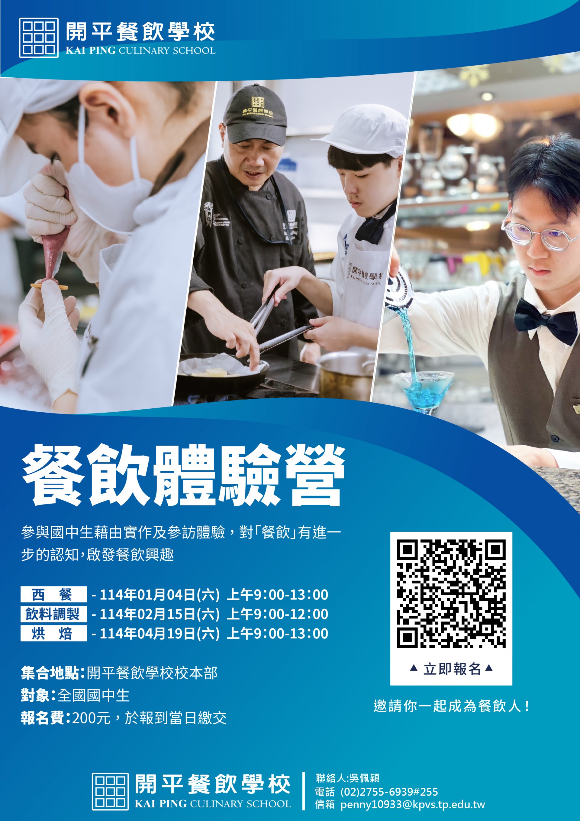 一、 | 為協助國中生認識技職體系之學習內容、教學特色及進路發展,本次活動為透過餐飲實作體驗更加了解技職教育,以料理展現自我、創造未來無限可能。 |