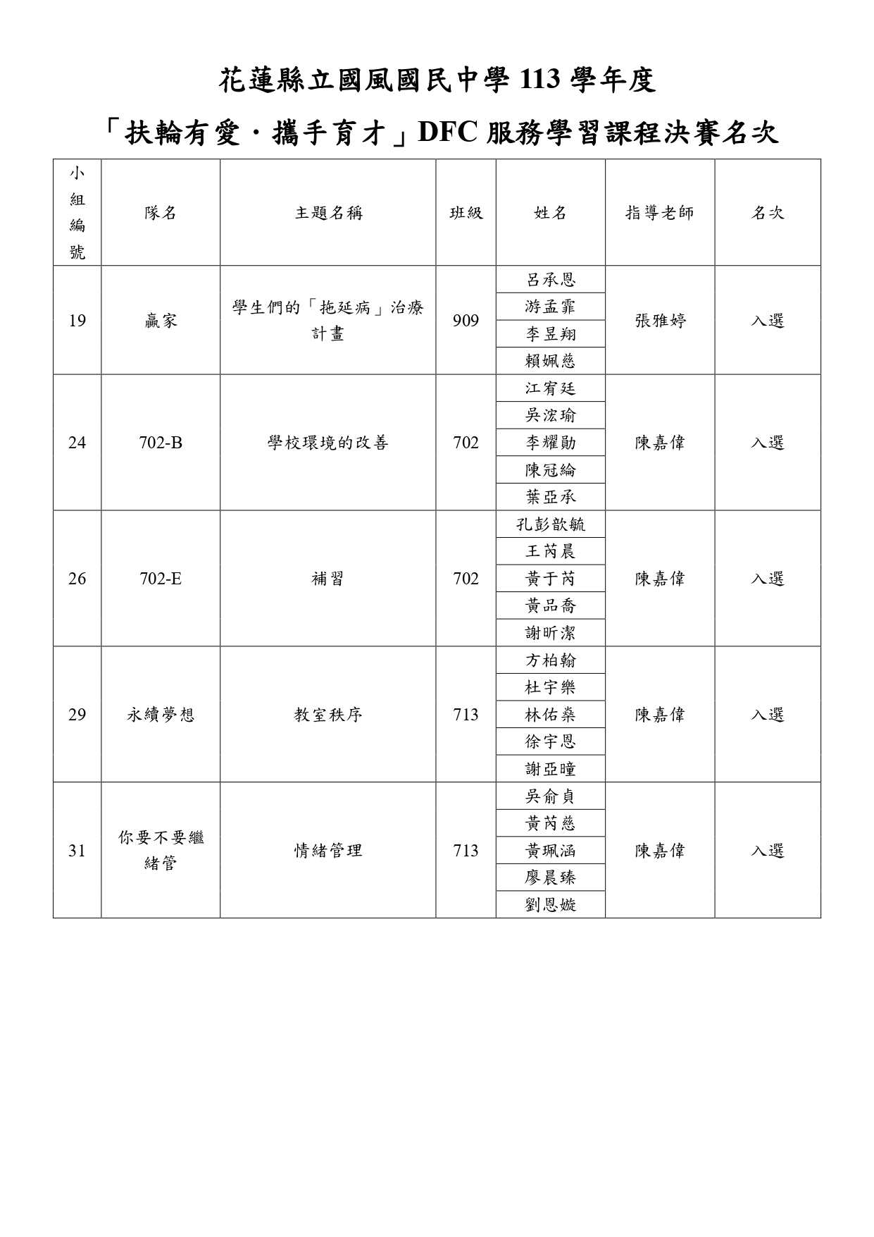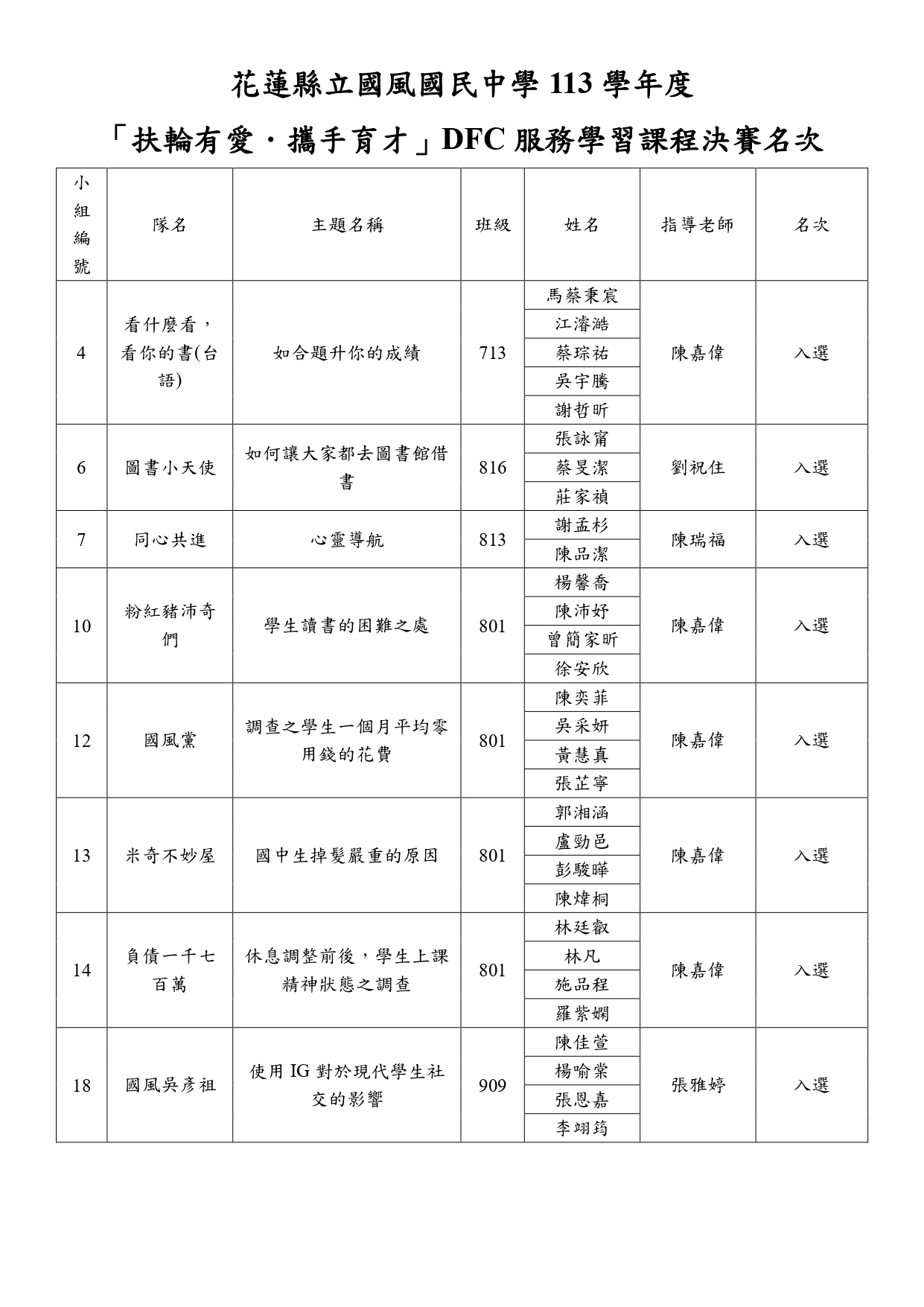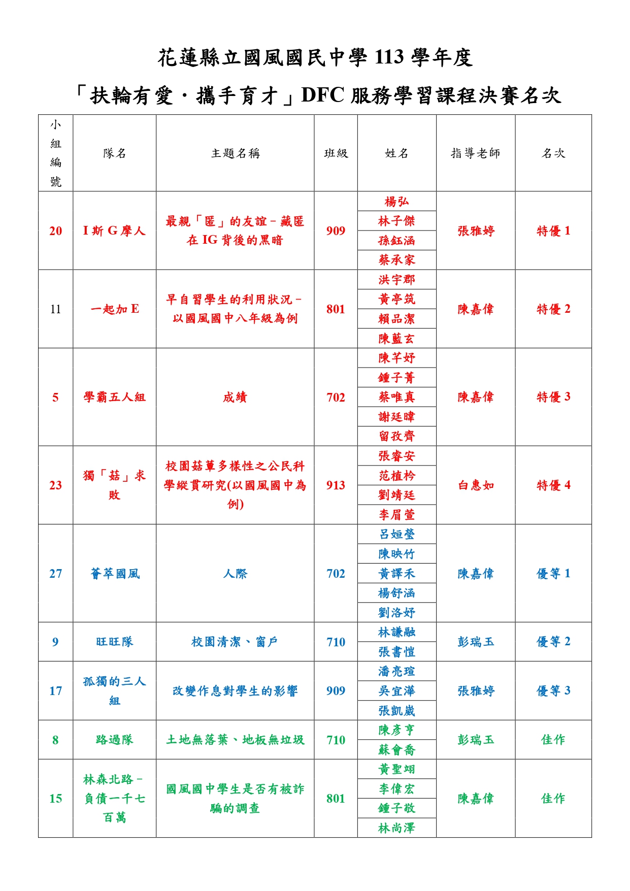 花蓮縣立國風國民中學113學年度「扶輪有愛.攜手育才」DFC服務學習課程成績公告