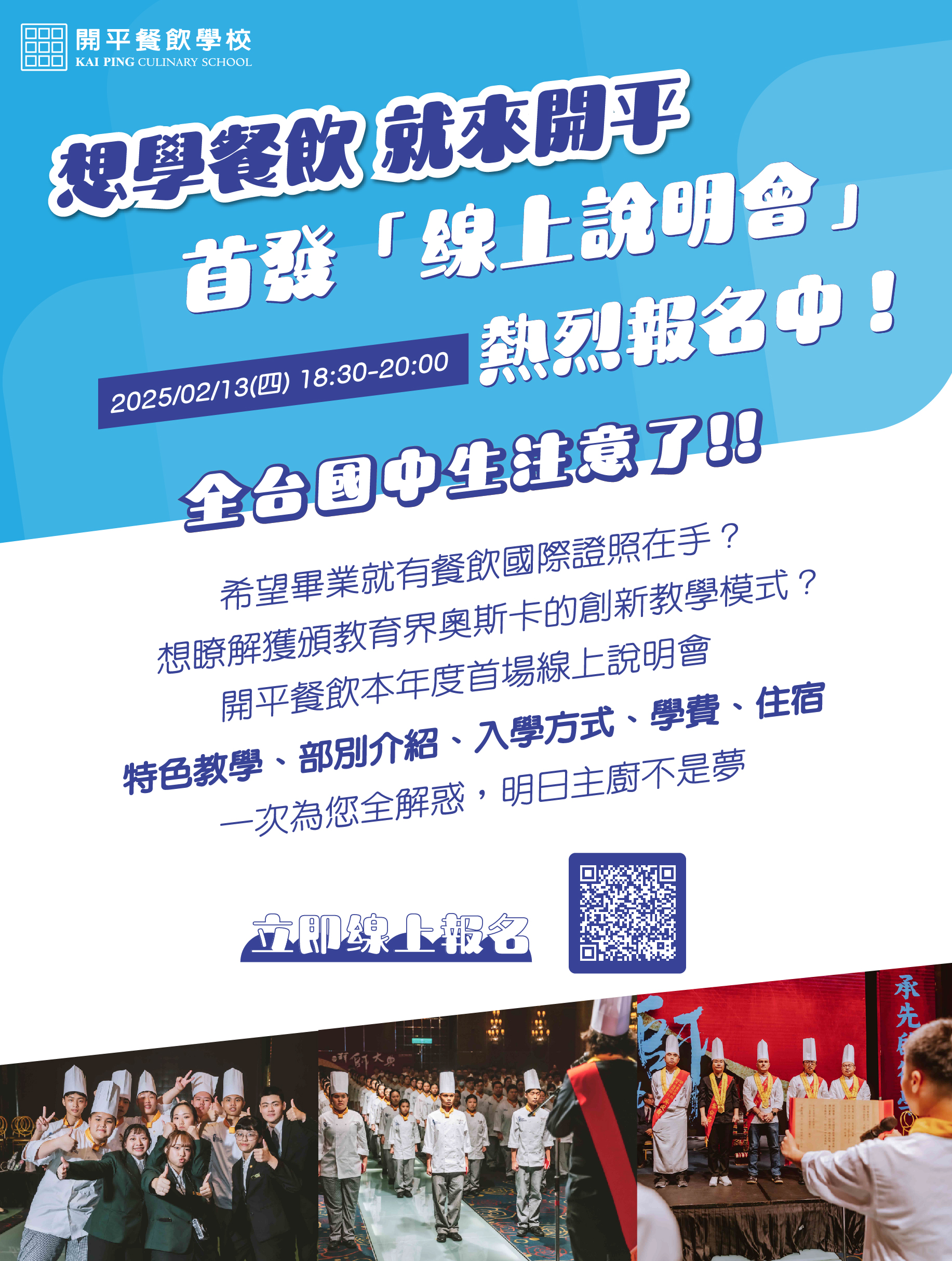 一、 | 為使更多國中學生對技職教育深入瞭解,本校並辦理「線上理念說明會」,提供學生、家長認識本校教育理念與餐飲教學特色,協助增進國中學生及其家長對職業類科升學管道及學習內容之試探,期望開平優秀學子成為臺灣及國際餐飲界之人才。 |