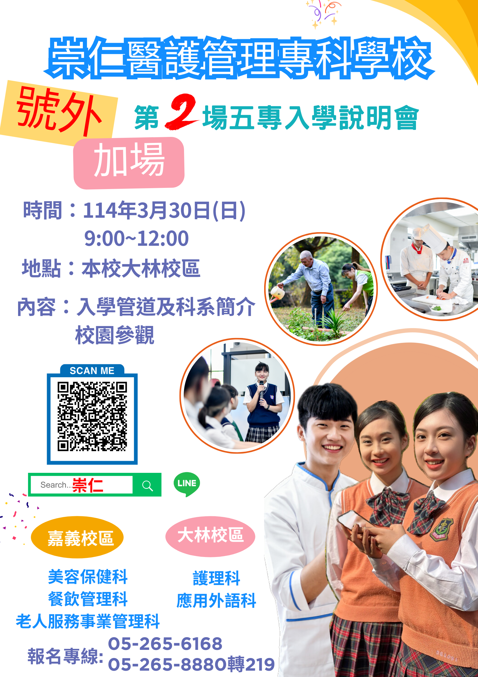 四、 | 聯繫方式:(05)2656168 / (05)2658880 分機 219 招生中心。 |