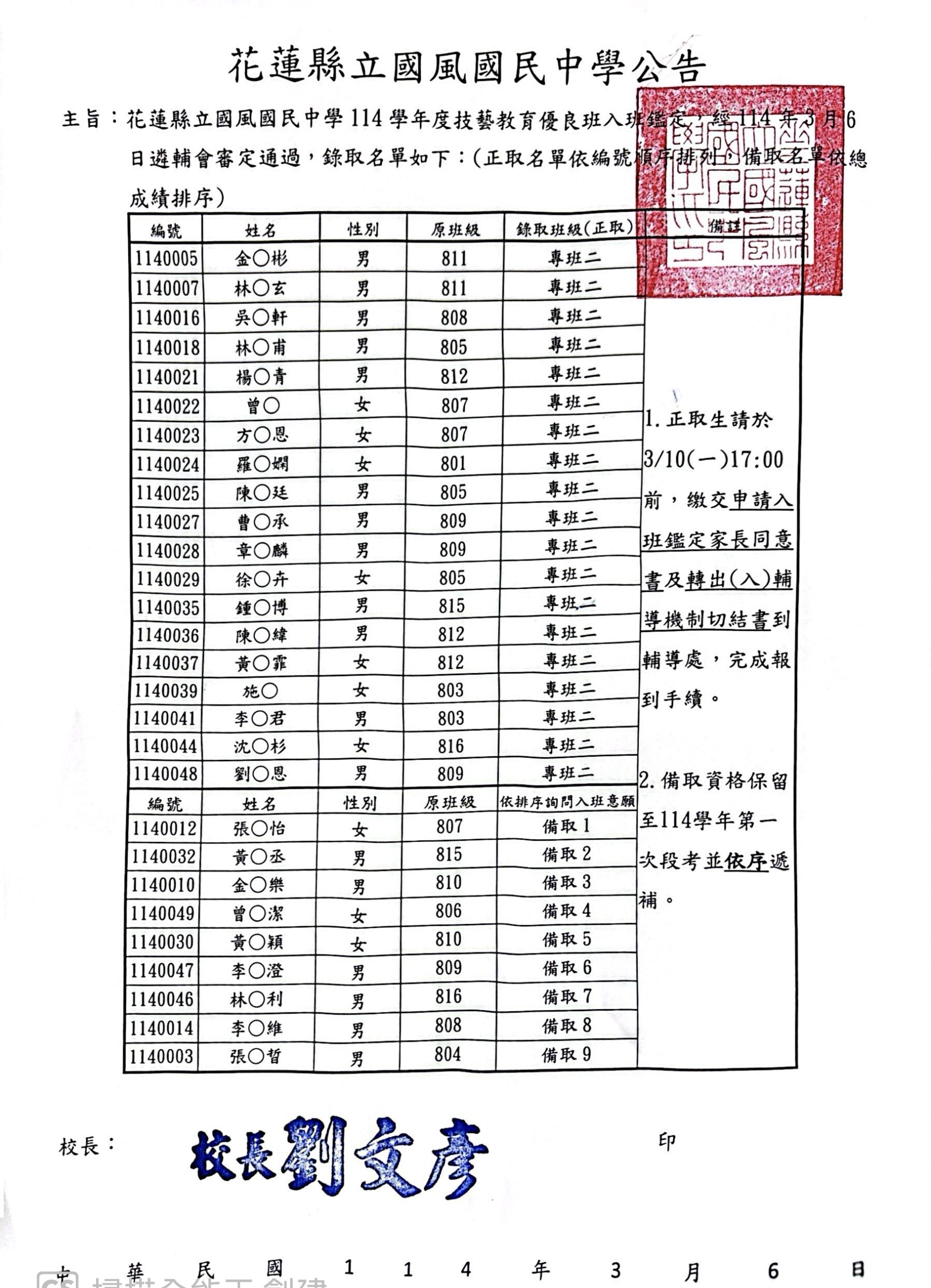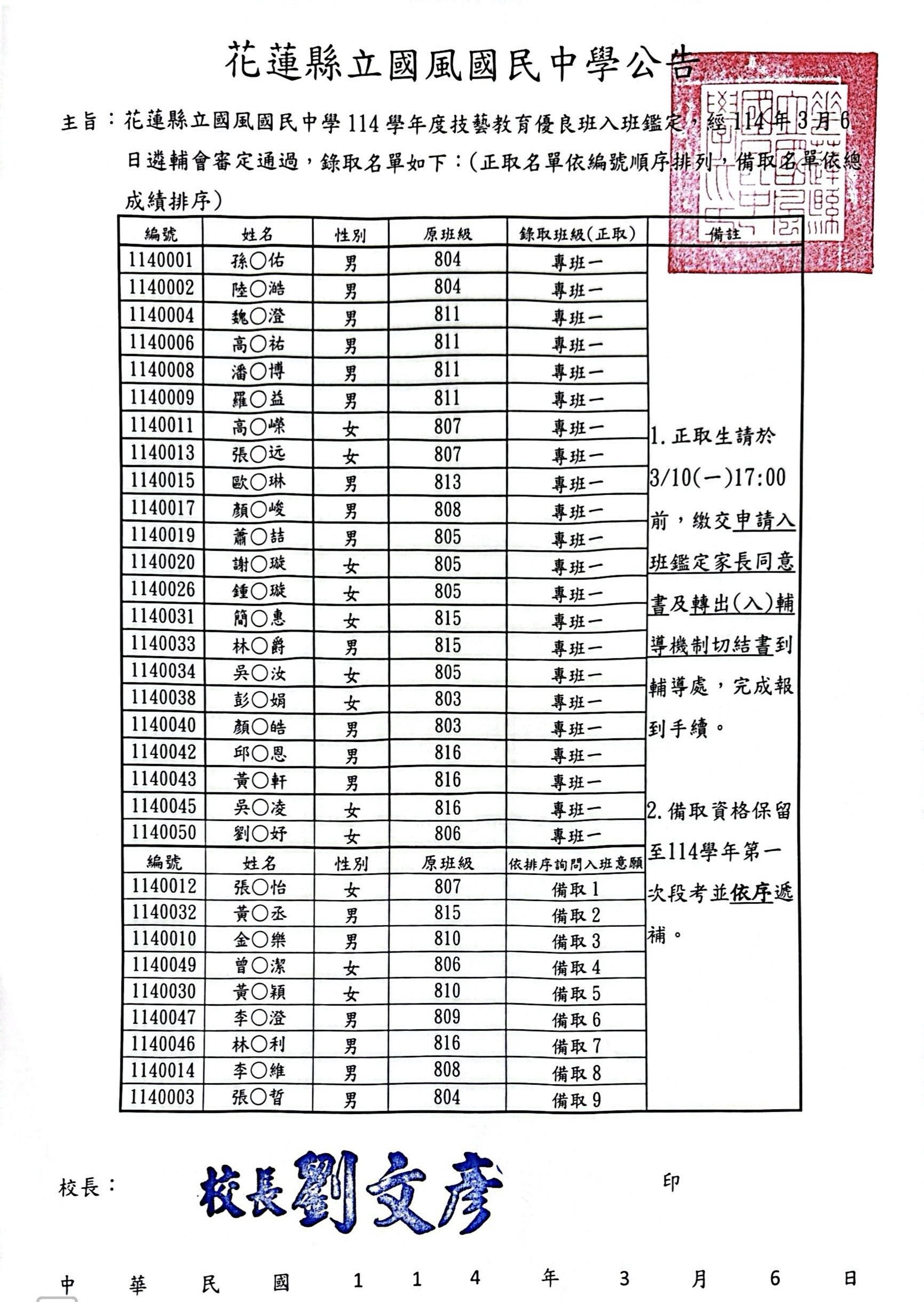 正取生報到日期: 114 年 3 月 7 日(星期五) 下午 17:00 分前至本校輔導處領取 申請入班鑑定家長同意書 及 轉出(入)輔導機制切結書。