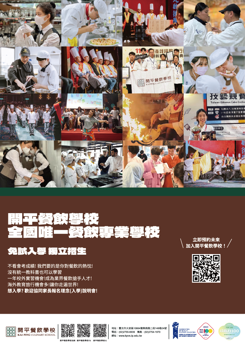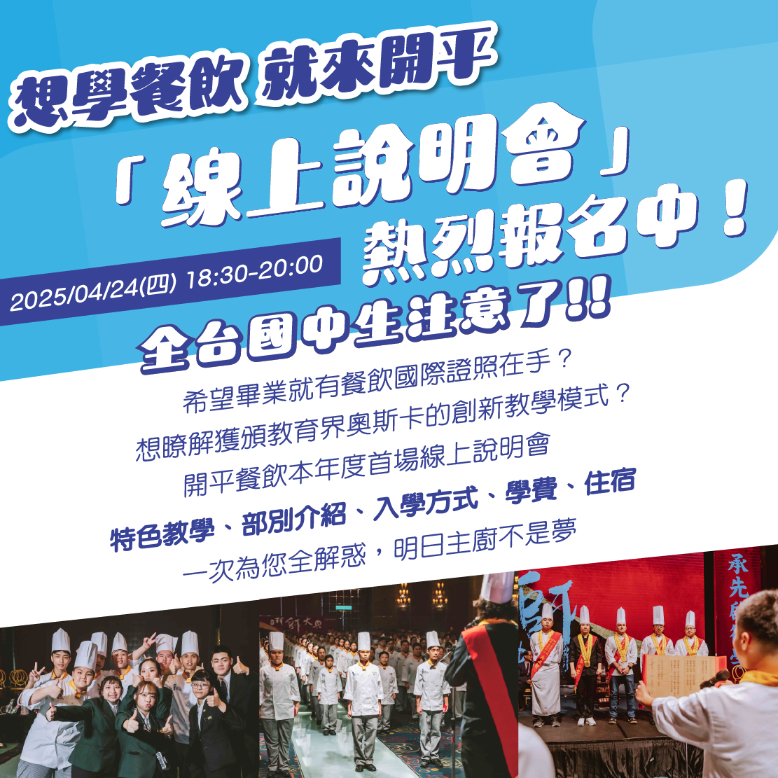 一、目的:為使更多國中學生對技職教育深入瞭解,臺北市私立開平餐飲職業學校辦理「實體理念說明會」及「線上理念說明會」,提供學生、家長認識臺北市私立開平餐飲職業學校教育理念與餐飲教學特色,協助增進國中學生及其家長對職業類科升學管道及學習內容之試探,期望開平優秀學子成為臺灣及國際餐飲界之人才。