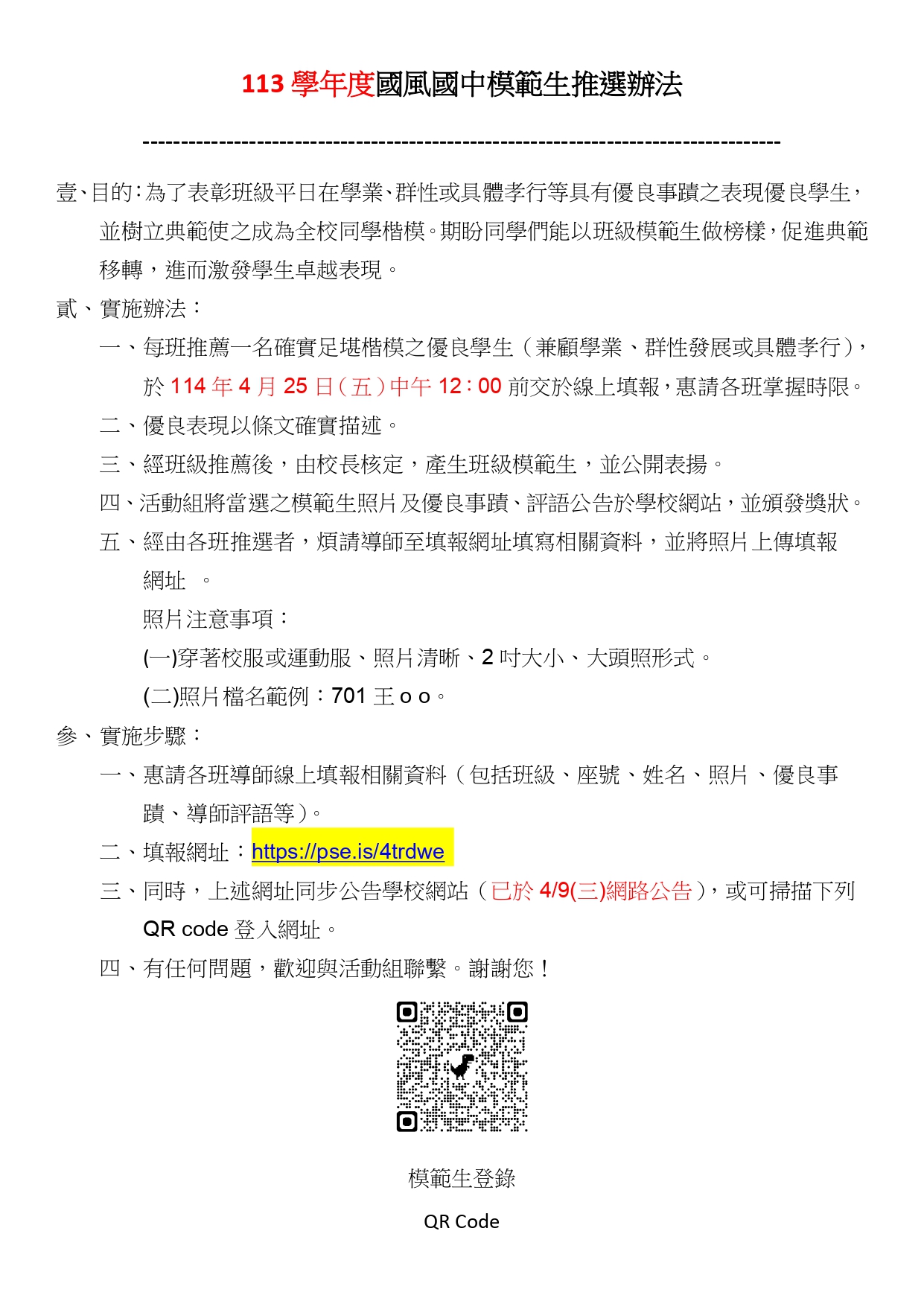 113學年度國風國中模範生推選辦法,請師長與同學參閱。填報網址詳見內容