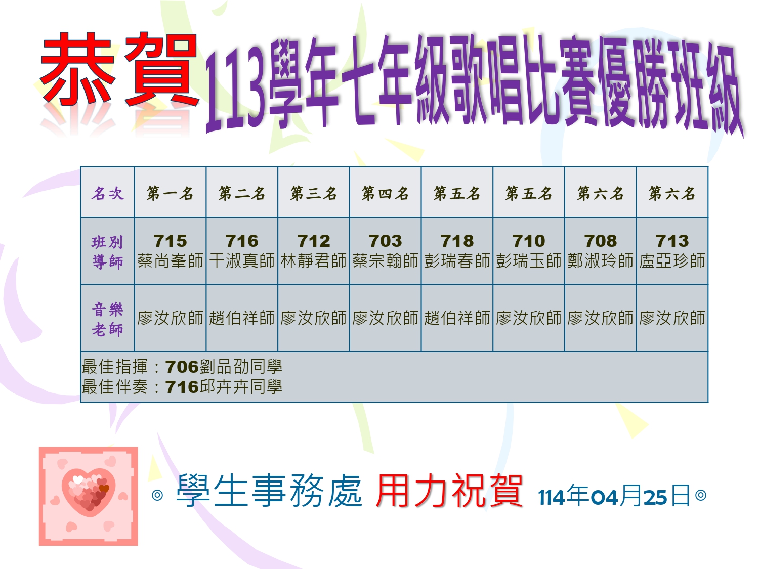 國風國中113學年度七年級班際歌唱比賽優勝班級,第一名715班;第二名716班;第三名712班;第四名703班;第五名718班、710班;第六名708班、713班,恭喜獲獎班級,感謝廖汝欣老師、趙伯祥老師以及各班導師辛苦指導。