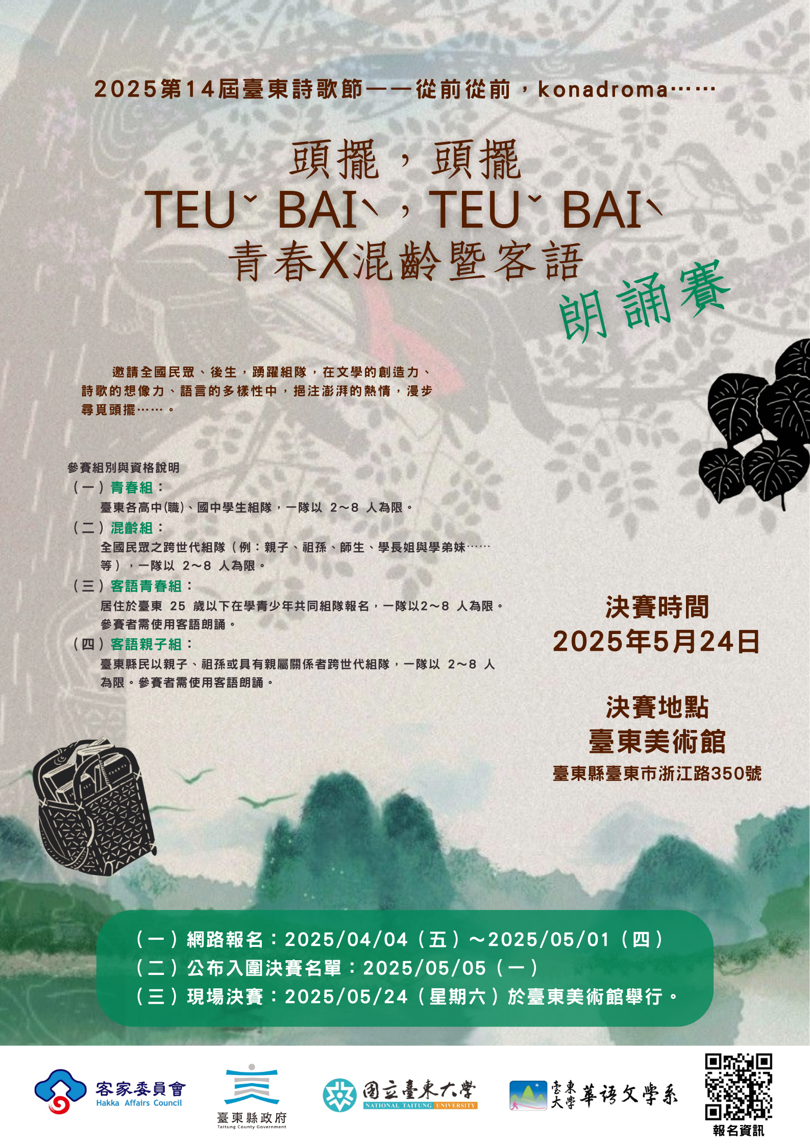 一、 | 第十四屆詩歌節在客家委員會的指導之下,並與臺東縣政府共同舉辦「頭擺,頭擺 teuˇbaiˋ, teuˇbaiˋ,青春╳混齡暨客語朗誦賽」,邀請全國民眾、後生,踴躍組隊,在文學的創造力、詩歌的想像力、語言的多樣性中,挹注澎湃的熱情,漫步尋覓頭擺,頭擺 teuˇbaiˋ, teuˇbaiˋ的流光,編織迤邐成炎炎夏日東海岸盡靚的風景,共創屬於你我的新記憶,好時光。 |