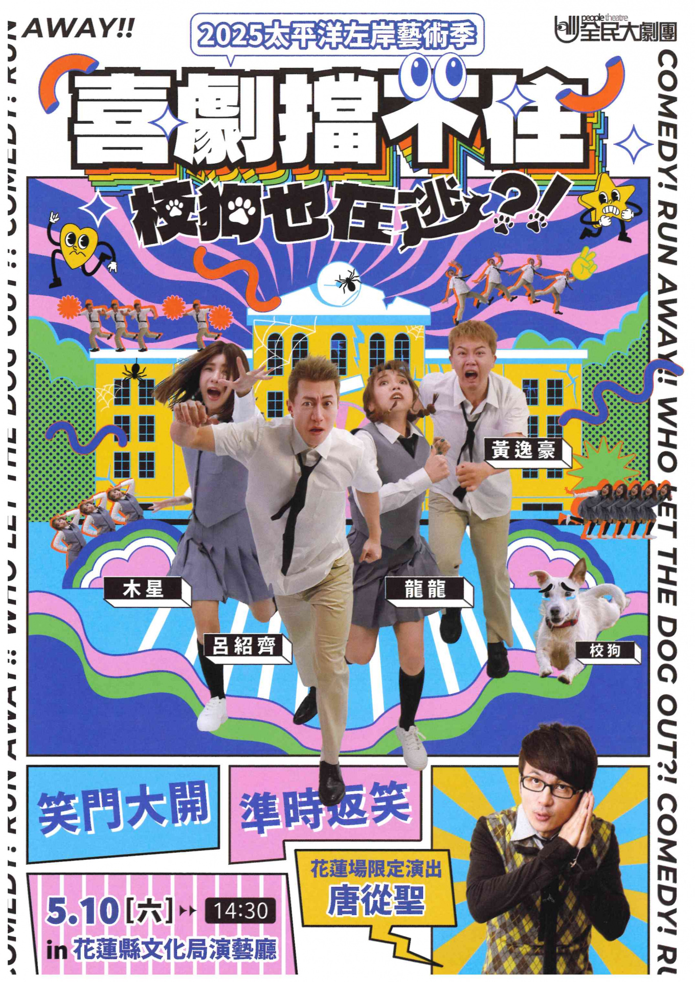 花蓮縣文化局宣傳本縣「2025太平洋左岸藝術季-全民大劇團《喜劇擋不住—校狗也在逃?!》」演出案,相關活動訊息請見內容。如需活動貼紙請到學務處活動組領取。