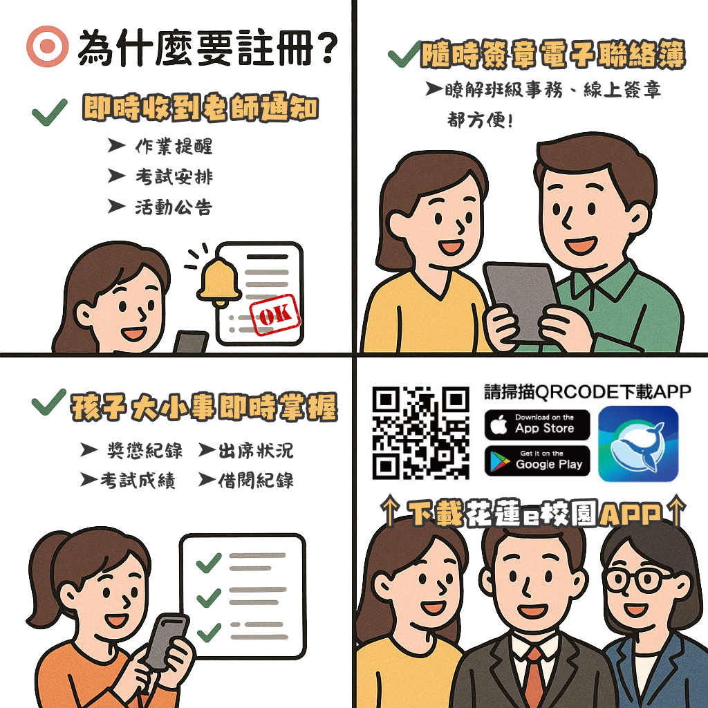 為了讓您能即時掌握孩子在校的學習與生活狀況,並與學校保持密切聯繫,我們誠摯邀請您踴躍申請「花蓮 e 校園 APP」。透過這個平台,您可以隨時收到學校最新公告、查詢孩子的成績與出缺席紀錄,還能即時回覆學校問卷,表達寶貴意見。讓我們一起善用科技,建立更順暢的親師溝通管道,共同守護孩子的成長與學習!