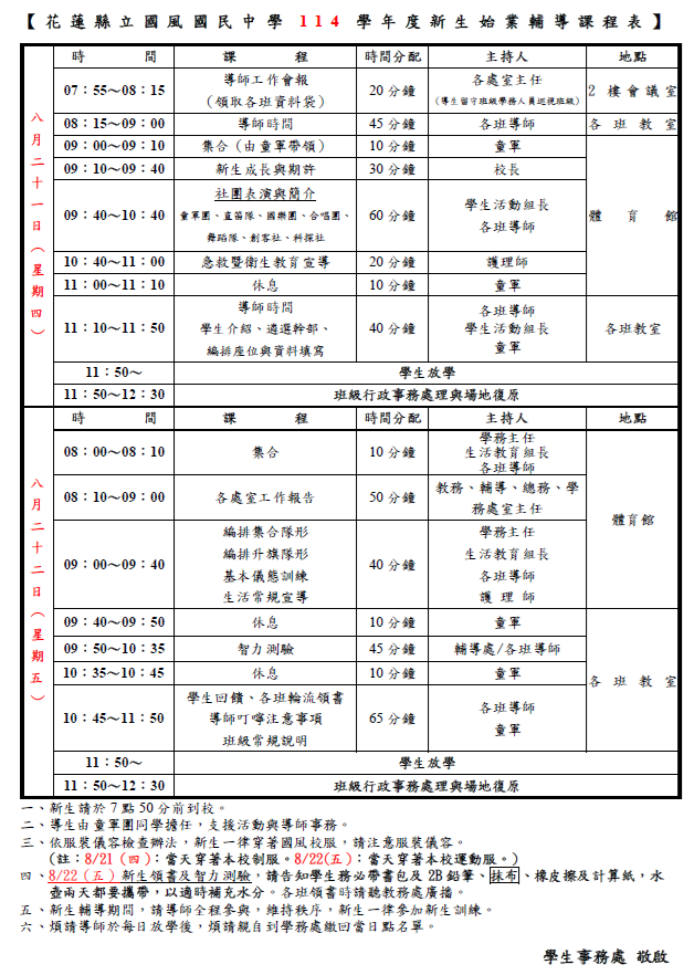 花蓮縣立國風國民中學114學年度新生始業輔導課程表,請師長、家長以及同學參閱